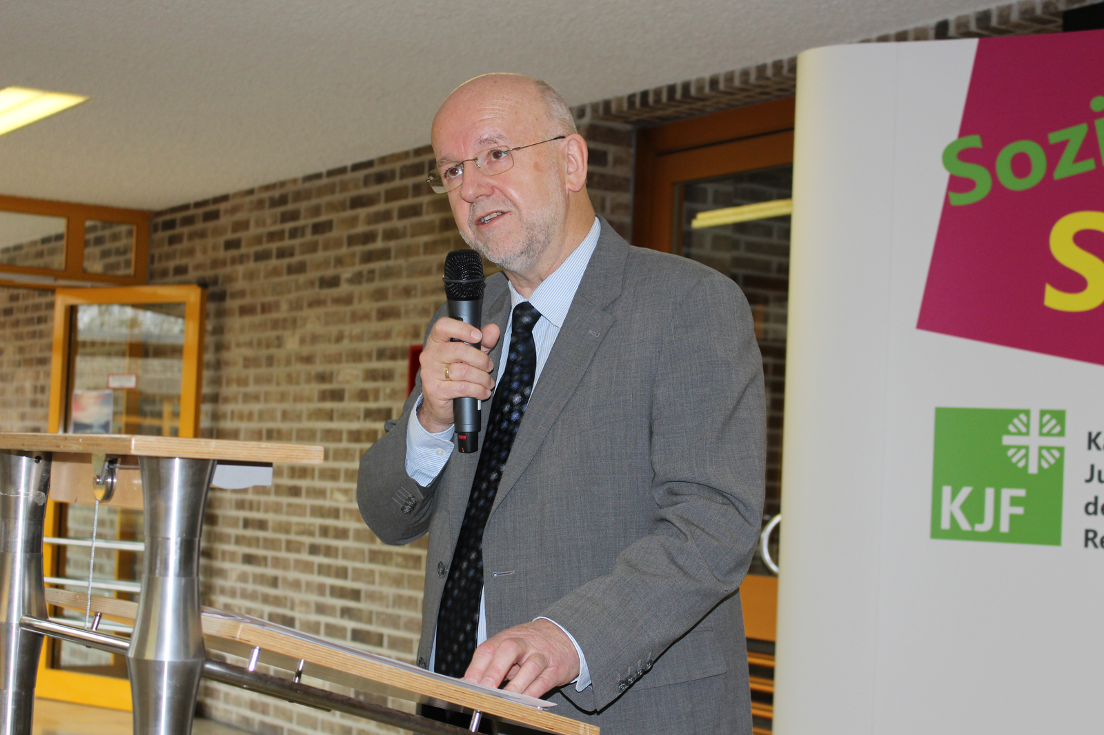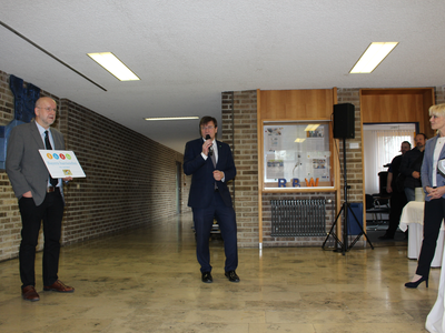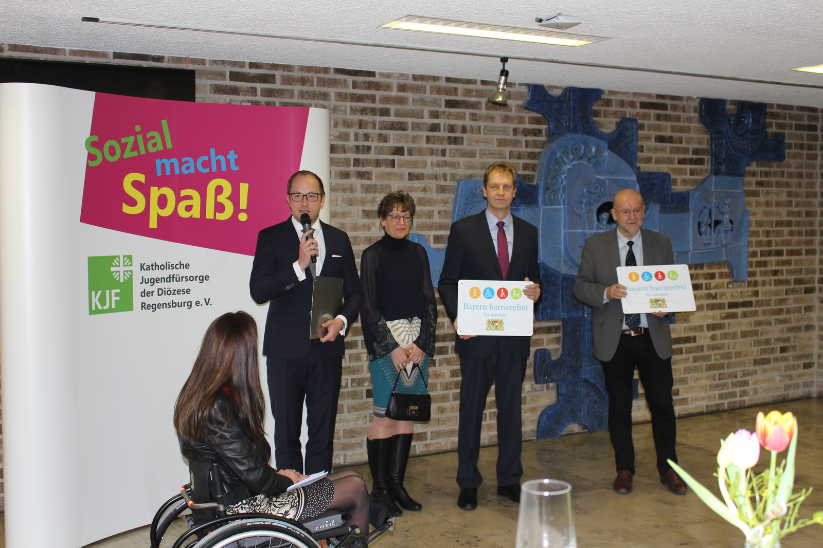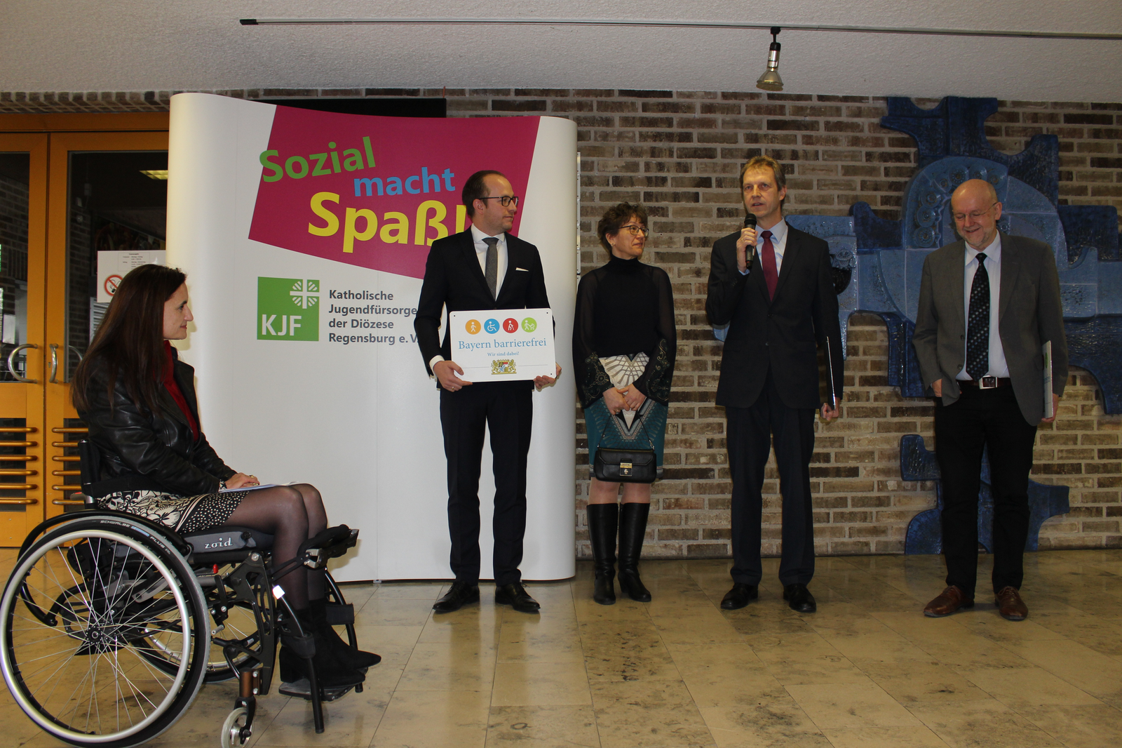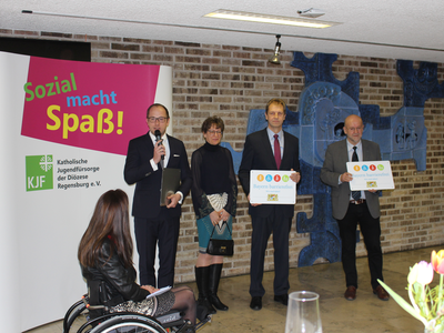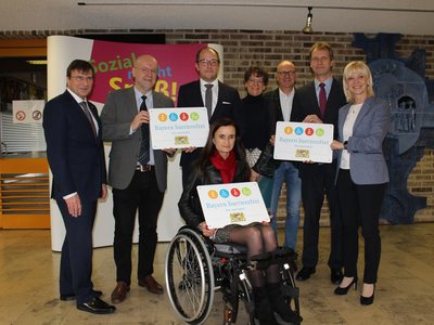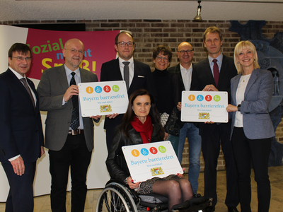 Das dritte Signet ging an das Berufsbildungswerk St. Franziskus Abensberg. Walter Krug, Gesamtleiter des Berufsbildungswerkes in Abensberg, bedankte sich für die Verleihung des Signets. Er bezeichnete die Barrierefreiheit als eine Herausforderung an eine inklusive Gesellschaft. „Der Abbau von Barrieren - sowohl für Kunden wie auch für Mitarbeiter - beginnt in den Köpfen und Herzen. Denn: Das Ziel der inklusiven Gesellschaft ist immer verbunden mit der Aufgabe, Barrieren für Menschen mit Beeinträchtigungen und Behinderungen zu beseitigen und die Barrieren auch zielgruppenspezifisch abzubauen“, betonte Walter Krug. „Wir als Berufsbildungswerk Abensberg werden eine umfassende Barrierefreiheit nicht ganz umsetzen können. Zu unterschiedlich sind unsere Behinderungs- und Beeinträchtigungsarten und zu heterogen ist der jeweilige Bedarf. Wir erleben Barrieren in den Köpfen und Herzen immer wieder, wenn wir uns beispielhaft an die Aufgabe machen für unsere anvertrauten jungen Menschen im Anschluss an ihre Ausbildung Arbeitsplätze auf dem Arbeitsmarkt zu finden“, so Krug erklärend. Umso mehr freute es ihn, dass mit dem BBW zwei Vertreter der Wirtschaft geehrt wurden, die nicht die baulichen Strukturen der Preisträger abbildet, sondern die Barrierefreiheit in ihren Köpfen und Herzen.