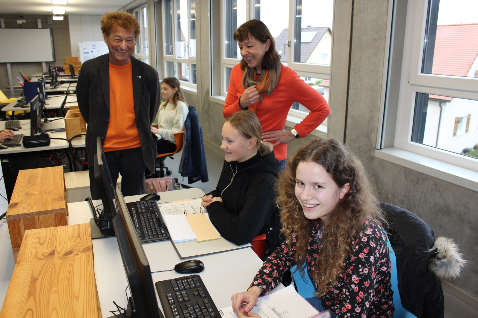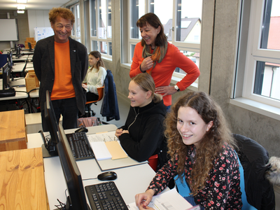 Im Bild oben Nicole Kallmünzer und Reinhard Zott am Firmensitz der Varoplan an der Münchener Straße. In der Galerie Rektor Wolfgang Brey und Studiendirektorin Petra Schlögl bei Wirtschaftsschülerinnen, die eine Übungs-Firma führen.