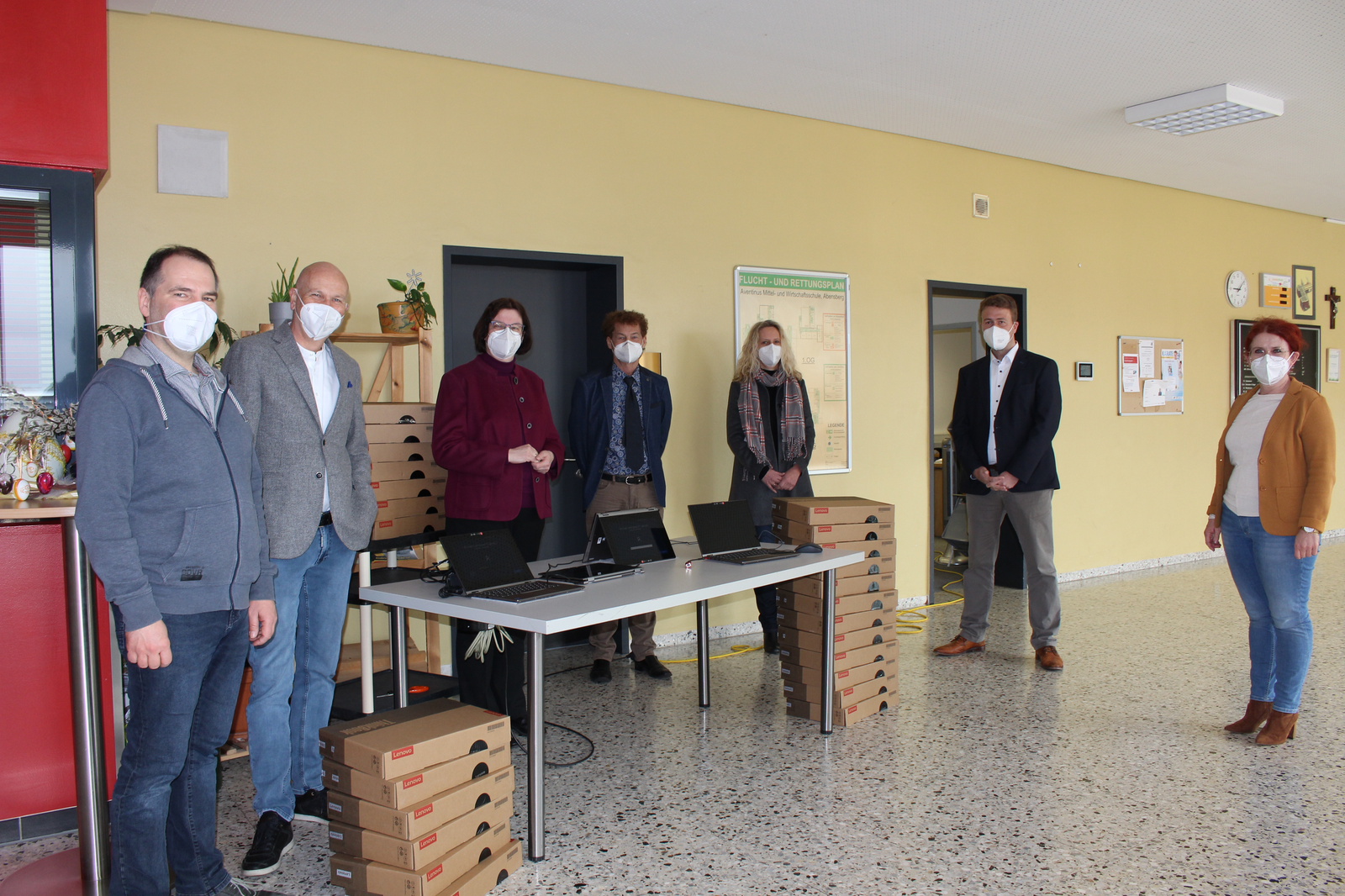 Der Vorsitzende des Schulverbands Abensberg-Biburg, Abensbergs 1. Bürgermeister Dr. Uwe Brandl, und die 1. Bürgermeisterin von Biburg, gleichzeitig zweite Vorsitzende des Schulverbands, Bettina Danner, überreichten insgesamt 59 Dienst-Laptops an die Schulleiter. In Abensberg sind dies Liane Köppl von der Grundschule Offenstetten; sie hat 13 MacBooks erhalten, da die Grundschule Offenstetten seit Jahren auf Apple setzt. Die Rektorin der Aventinus Grundschule Abensberg, Andrea Brandl, hat 17 Windows-Laptops erhalten, Wolfgang Brey, Rektor der Aventinus Mittelschule, erhielt 26. Oberstudienrat Martin Schweiger hat für die Staatliche Wirtschaftsschule Abensberg drei Laptops erhalten.