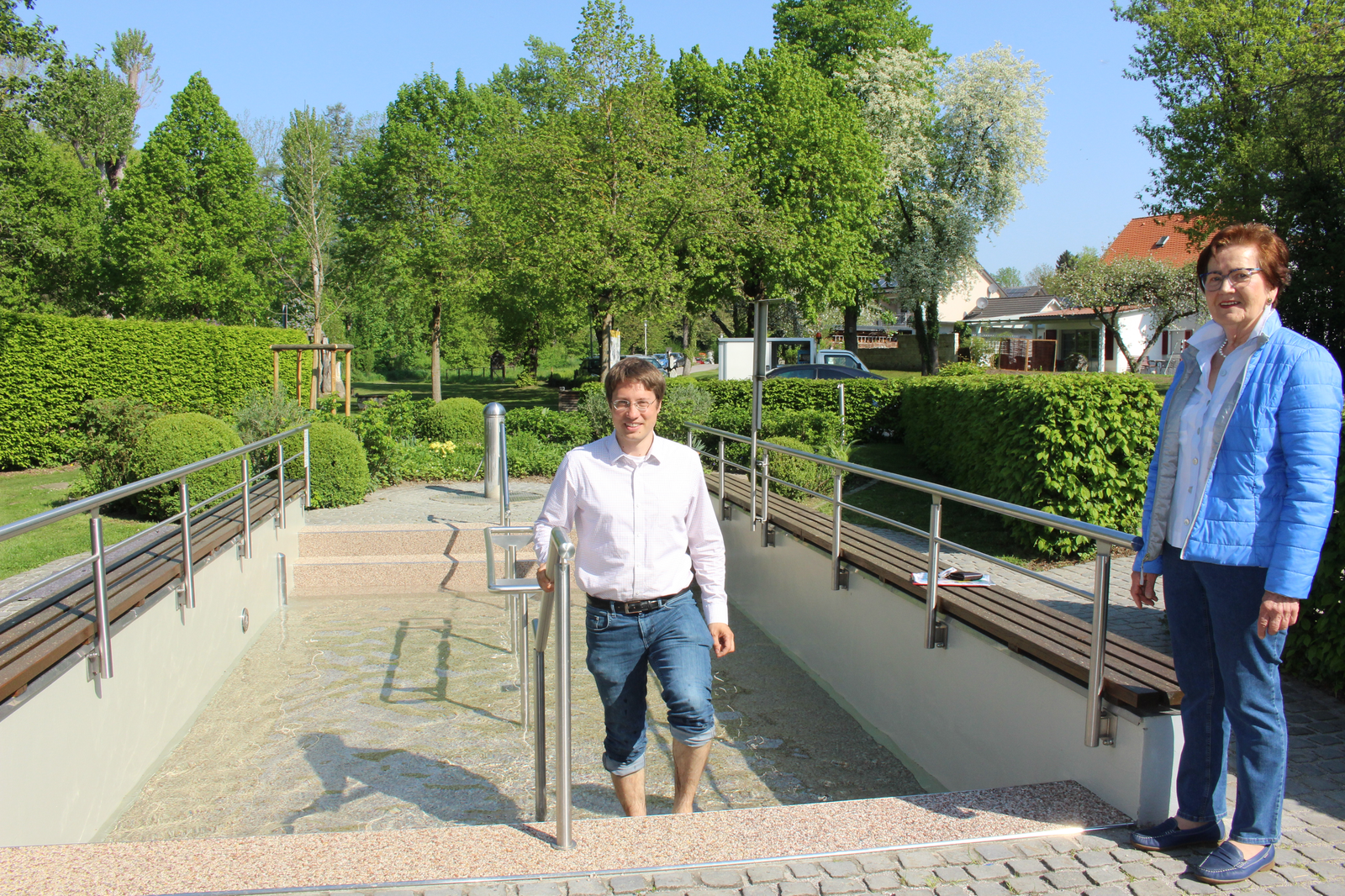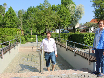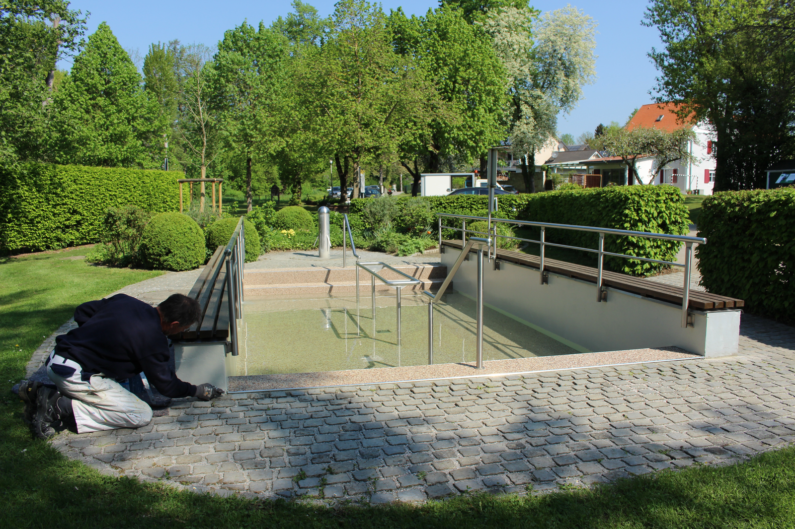 Hauptfoto: Zum Foto hat sich der Stadtwerkeleiter Dr. Rainer Reschmeier unter der fachlichen Anleitung von Gerda Pfaffeneder ins Wasserbecken begeben. Die 1. Vorsitzende des Kneipp-Vereins freut sich auf den 21. Mai, wenn die gesamte Anlage quasi offiziell eröffnet wird. Um 14 Uhr geht’s los, auch für Kinder ist sehr viel geboten.