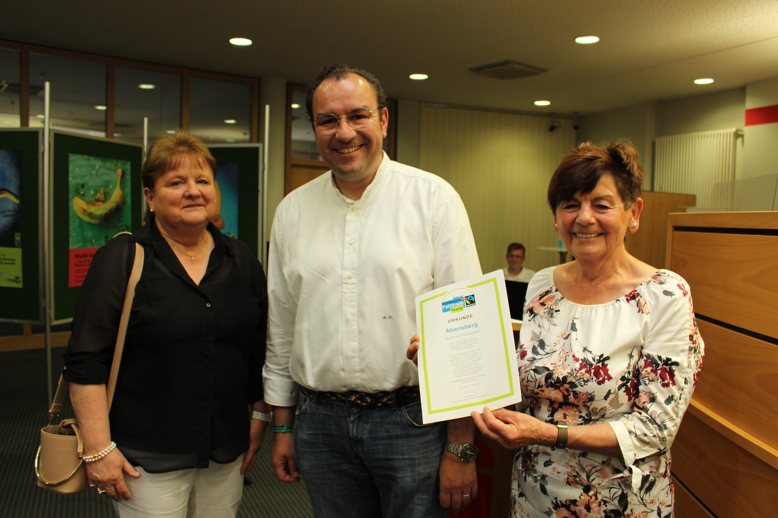 Aus der Urkunde: „Abensberg bleibt Fairtrade-Stadt. Nach Erfüllung aller Kriterien der Kampagne Fairtrade-Tiowns darf Abensberg weiterhin den Titel Fairtrade-Stadt tragen. Durch ihr Engagement für den fairen Handel vor Ort nimmt die Stadt Abensberg eine Vorreiterrolle ein. Dies setzt ein konkretes Zeichen für eine gerechtere Welt, indem Abensberg dazu beiträgt, dass durch faire Handelsbeziehungen den benachteiligten Produzentengruppen (…) zu einem verbesserten Einkommen verholfen wird. Wir bedanken uns herzlich für Ihren Einsatz!“ – Köln, 20. Mai 2022. Abensbergs 1. Bürgermeister Dr. Uwe Brandl, der am Abend selbst verhindert war: „Ich gratuliere der Lenkungsgruppe zu diesem Erfolg und freue mich, dass wir uns weiterhin mit dem Fairtrade-Logo schmücken dürfen.“