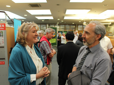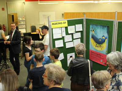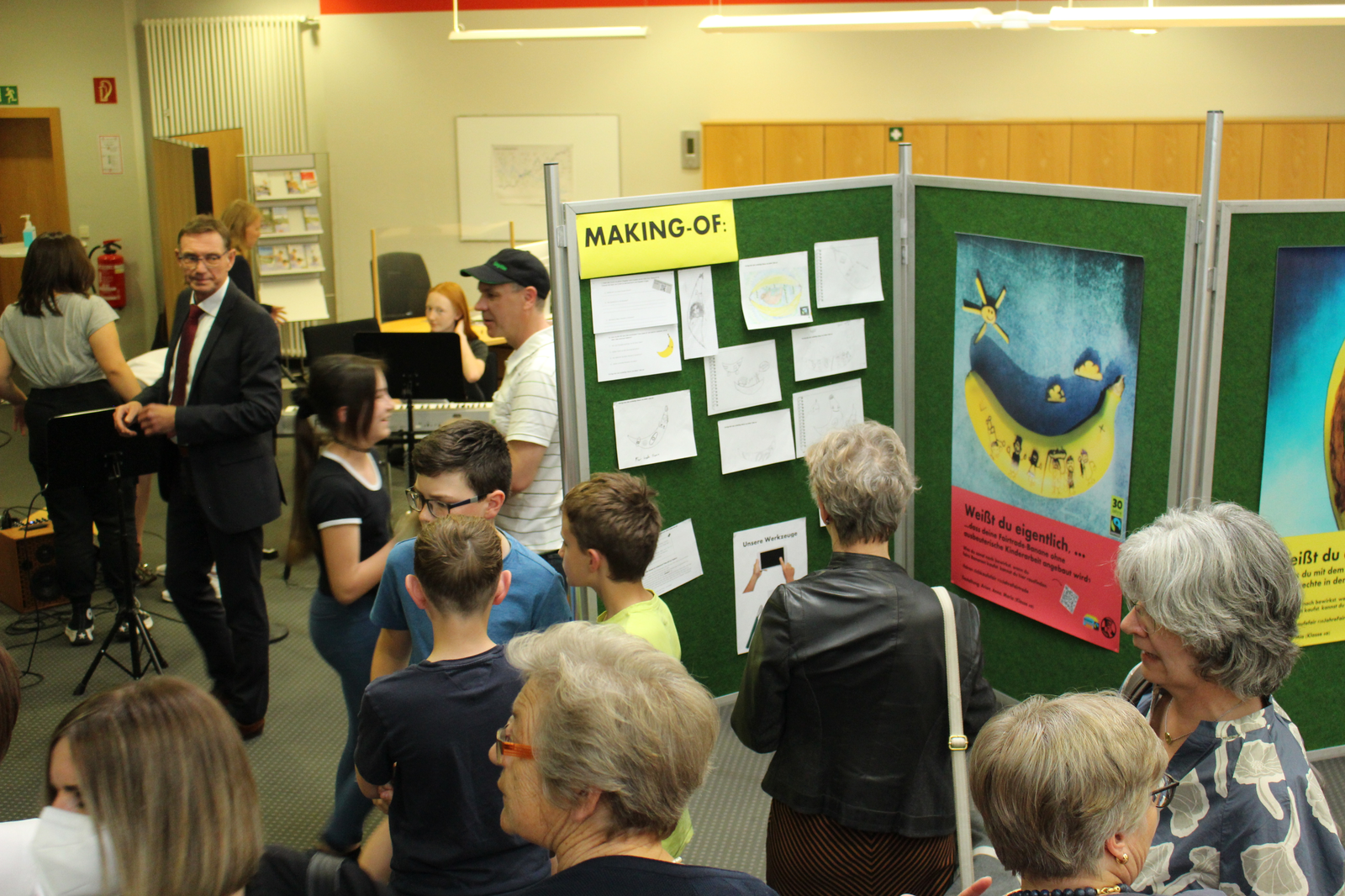 Im Bild oben sind Schülerinnen und Schüler der 6a, der Schulband, Lehrer, Schulleiter, Fairtrade-Aktive, Hausherr Reinhard Handschuh und 2. BM Dr. Bernhard Resch zu sehen. Im ersten Bild der Galerie links Johannette Bohn, 2. BM Dr. Bernhard Resch und Klara Wirthensohn. Im nächsten Bild am Pult Klara Wirthensohn, vor ihr 2. BM Dr. Bernhard Resch, 2. von rechts ist Schulrektor Dr. Peter Spateneder. Es folgen Schnappschüsse vom Abend und einige Motive der Ausstellung. Nochmals das Hauptmotiv.