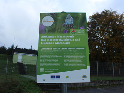 Im Hauptbild oben von links Georg Ipfelkofer, Dr. Rainer Reschmeier, Dr. Uwe Brandl, Madlaina Götz, Wolfgang Ferg und Michaela Powolny. In der Galerie das entsprechende schild und nochmals das Hauptbild. Dazu ein Foto, das zum Abschluss der Errichtung der Photovoltaikanlage Anfang Juli am Klärwerk gemacht worden ist – diese Anlage befindet sich auf Stelzen und ist deshalb für insektenfreundliche Maßnahmen geeignet. Klärwerksleiter Konrad Ettengruber hat dem Stadtwerkeleiter Dr. Rainer Reschmeier und dem 2. Bürgermeister Dr. Bernhard Resch gezeigt, dass er den Bereich insektenfreundlich gestalten möchte. Diese Fläche ist nun eine der Flächen, die sich im „Starterkirt“-Projekt befinden.