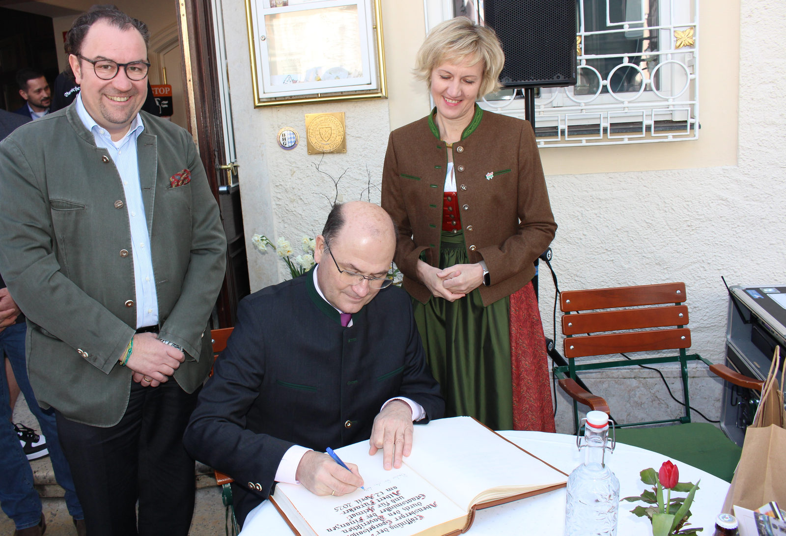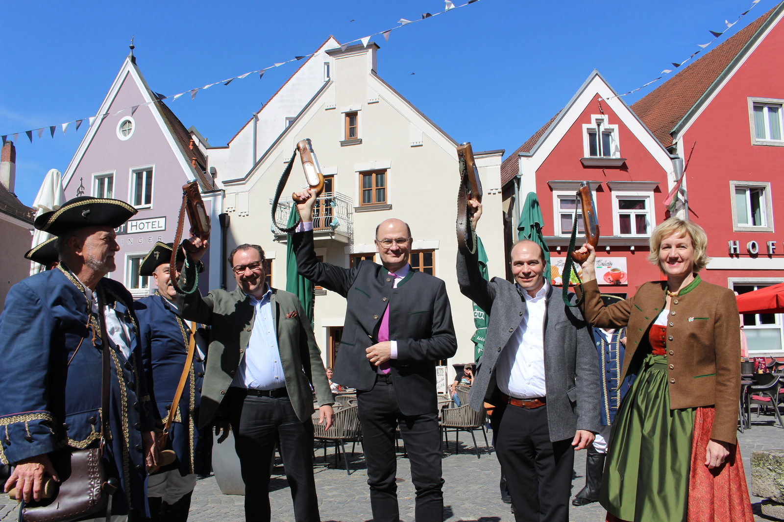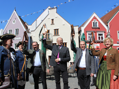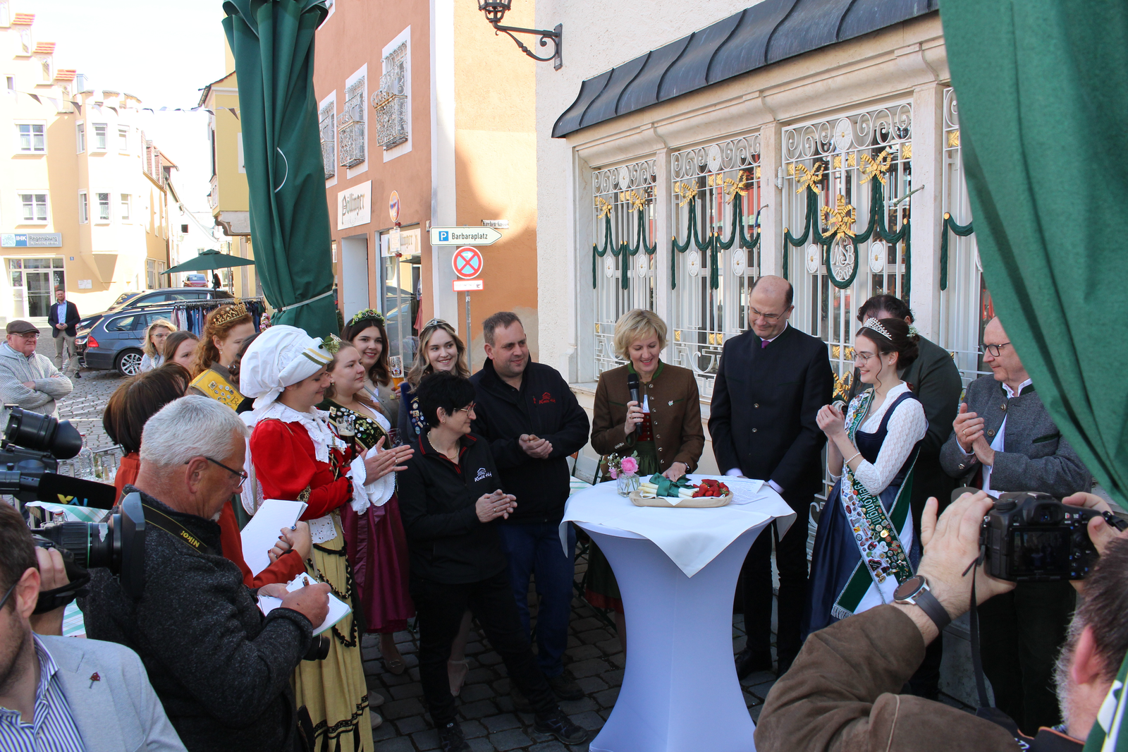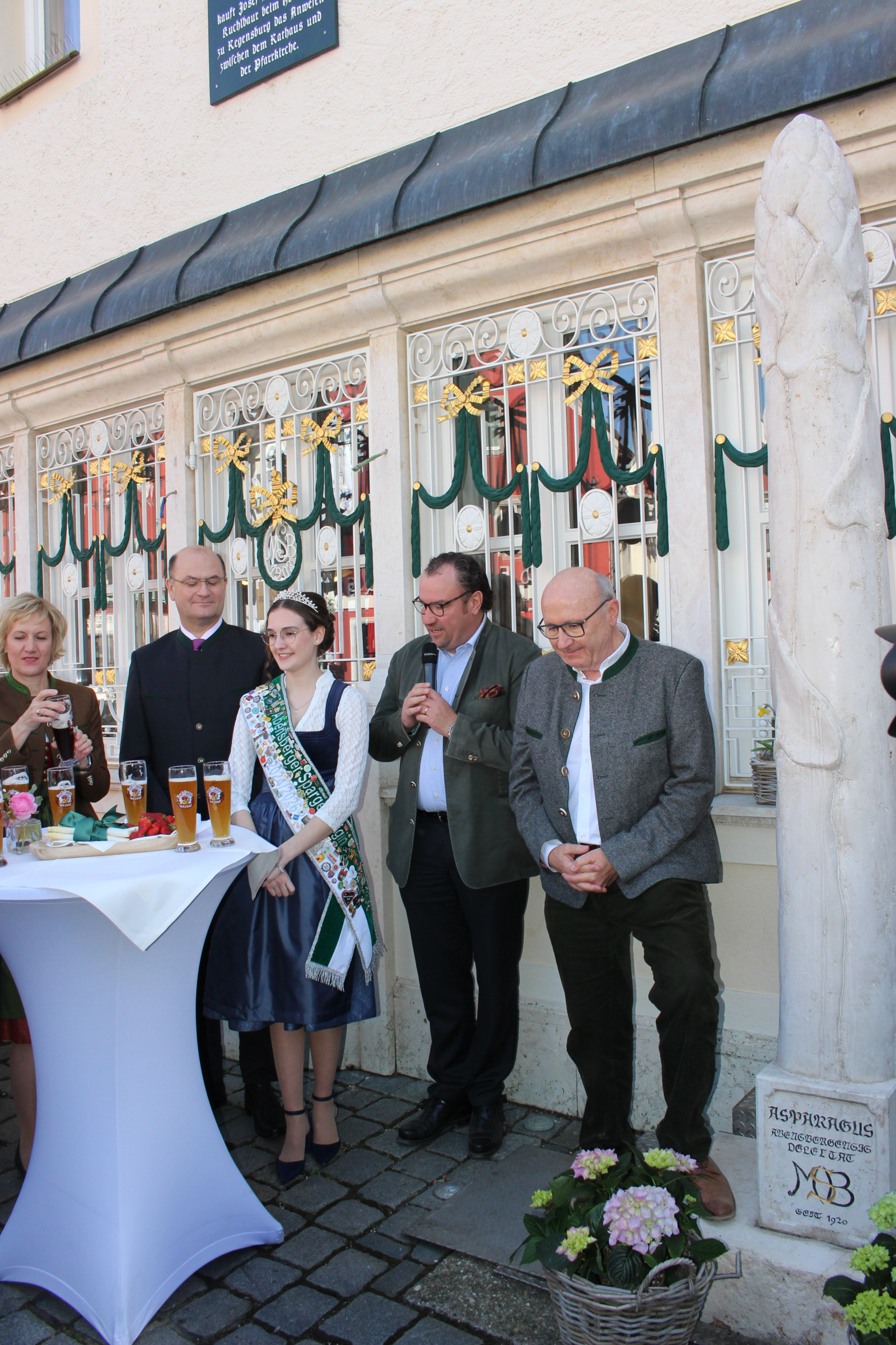 Anschließend verlagerte sich das Geschehen auf den belebten Abensberger Stadtplatz. Vor dem Brauereigasthof zum Kuchlbauer wurde dort, als weithin sichtbares Zeichen für den Saisonstart, die bekannte Marmor-Spargel-Statue traditionell für die Dauer der Spargelzeit ausgefahren. Auch die Böllerschützen von der Königlich Privilegierten Feuerschützengesellschaft Abensberg begrüßten den Beginn der neuen Saison standesgemäß. Minister Füracker unterstrich in seiner Festrede auf dem Stadtplatz die hohe Bedeutung des Abensberger Spargels: „Unser Abensberger Spargel gehört zu den besten regionalen Produkten und steht für die herausragende Qualität unserer Landwirtschaft. In Bayern wächst nicht nur der Spargel, sondern auch die Wertschöpfung für unsere Region.“ Weiter betonte er, jeder Biss zeige das Engagement unserer Landwirte, die sich tagtäglich für Frische, Qualität und Nachhaltigkeit einsetzen. Er bedanke sich zudem sehr herzlich bei allen Landwirten, die mit viel Liebe und Einsatz dafür sorgen, dass wir die besten Produkte direkt aus der Region genießen können. Während viele Obst- und Gemüsesorten dank weltweiter Importe das ganze Jahr über verfügbar seien, bleibe die schneeweiße oder grüne Wurzel dieses Liliengewächses ein echtes Saisonprodukt, das Geduld erfordere und damit umso wertvoller ist.