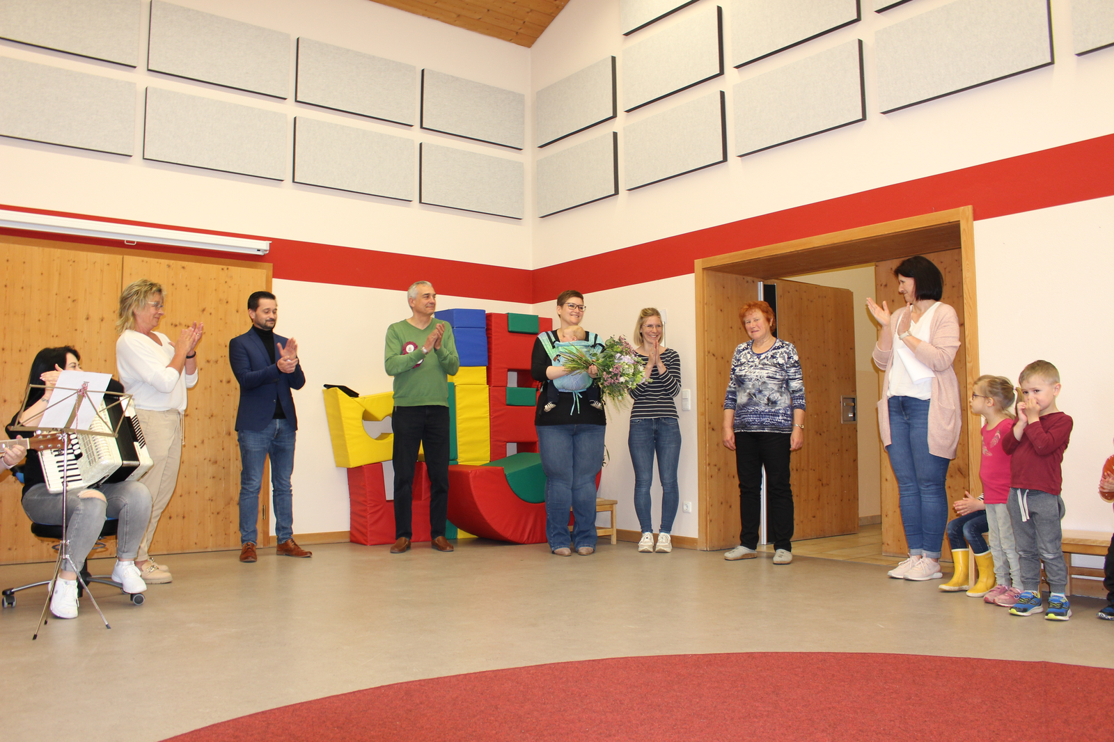 Im Kindergarten „Fridolins Kindernest“ in Sandharlanden wurde am Donnerstag (4. Mai 2023) Kinderpflegerin Angelika Zinner in den Ruhestand verabschiedet. Seitens der Stadt Abensberg dankte Hauptamtsleiter Andreas Müller herzlich für ihre geleistete Arbeit zum Wohle der Kinder und überreichte ihr einen Blumenstrauß. Personalleiter Franz Piendl sagte, sie sei „immer einsatzbereit“ gewesen und habe, wenn Not herrschte, stets ausgeholfen. Das sei nicht selbstverständlich. Kindergartenleiterin Birgit Firth dankte der Kollegin für ihre Zuverlässigkeit und ihren liebevollen Umgang mit den Kindern – und auch mit dem Team.