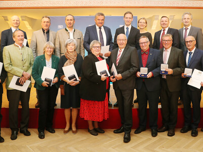In der Galerie, Bild 1, Gruppenbild: Der stellvertretende Ministerpräsident Hubert Aiwanger, Regierungspräsident Rainer Haselbeck und Regierungsvizepräsidentin Monika Linseisen beglückwünschen die Geehrten: Das Foto zeigt (Reihe hinten, von links): Günter Köck, Josef Spannmacher, der stellvertretende Ministerpräsident Hubert Aiwanger, Jürgen Fundke, Regierungspräsident Rainer Haselbeck und Regierungsvizepräsidentin Monika Linseisen, Gerald Rost und Martin Hofstetter; (Reihe vorne, von links): Hans Agsteiner, Karl Stiglmeier, Gisela Floegel, Gertraud Schretzlmeier, Waltraud Scheitinger, Rudolf Lehner, Günter Schuster, Josef Hopfensperger, Josef Salzberger, Franz Aunkofer.
