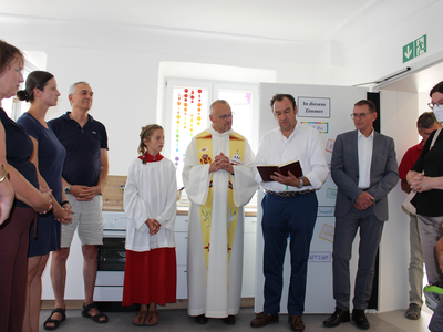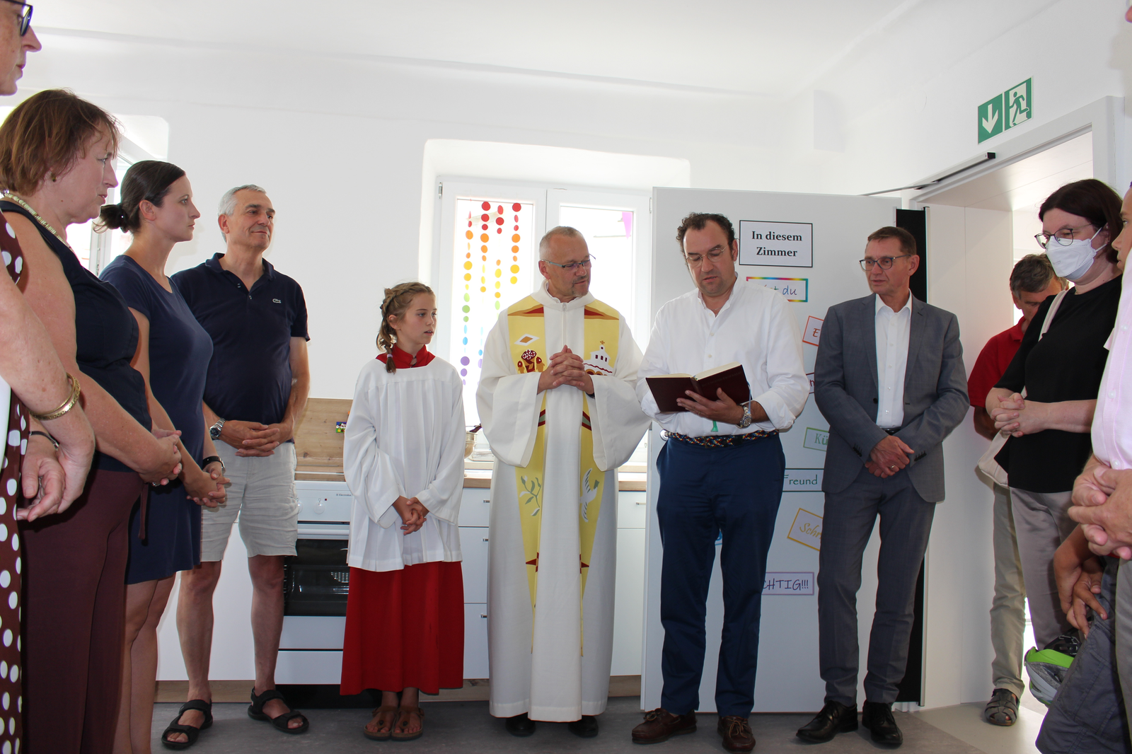 Pfarrer Georg Birner informierte kurz über die Geschichte des Hauses, das 1816 als Schulhaus erbaut und später vom Orden der Armen Schulschwestern bewohnt wurde. Als Ministrantin hatte Pfarrer Birner Josefine dabei – sie wurde als Kind im „Regenbogenland“ betreut und assistierte nun die Segnung der „Außenstelle“.