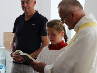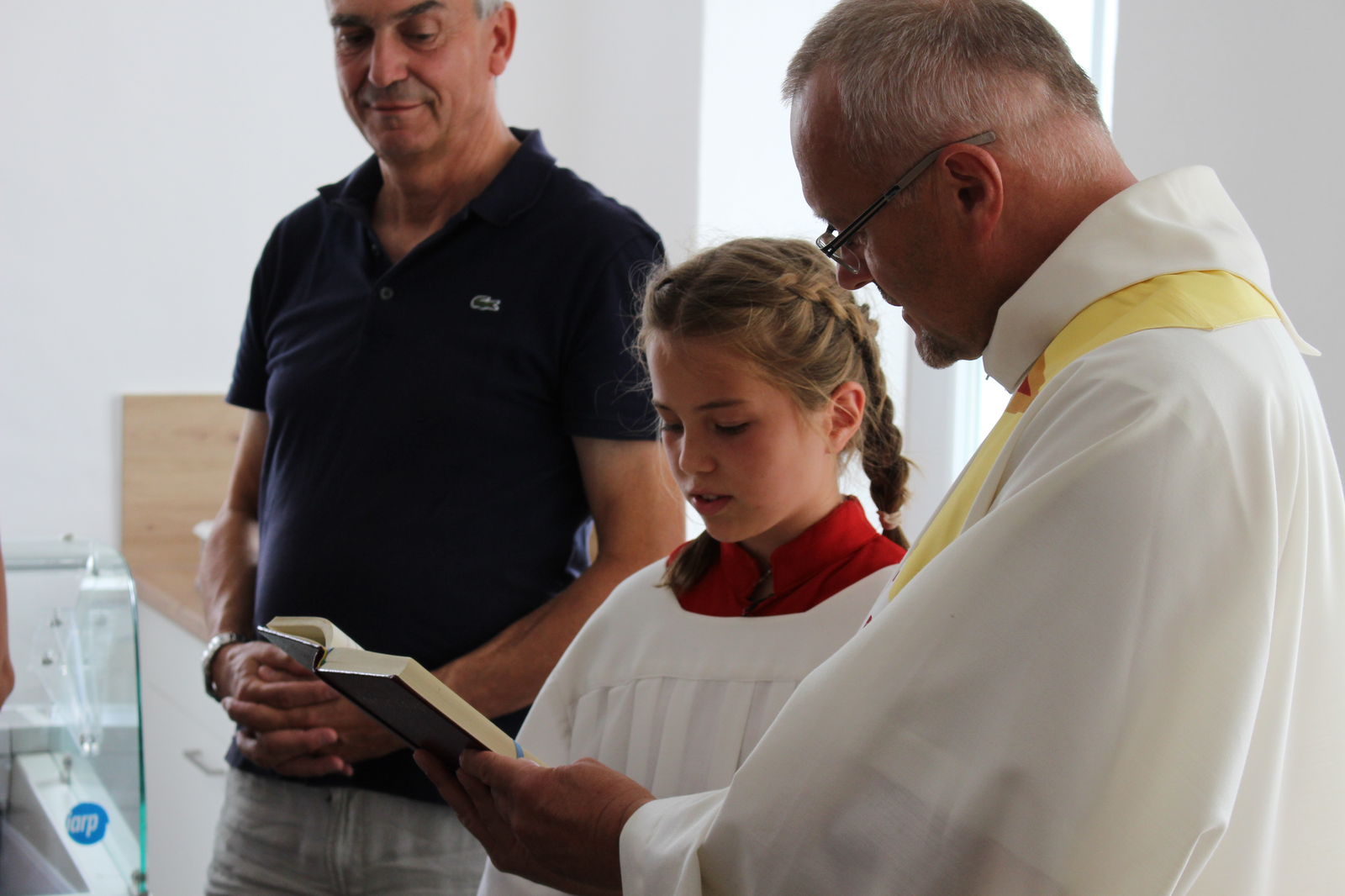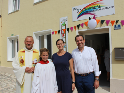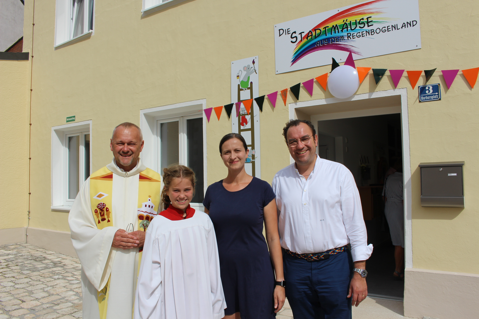 Im Bild oben von links: Pfarrer Georg Birner, Ministrantin Josefine, Leiterin Julia Söllner und 2. Bürgermeister Dr. Bernhard Resch.