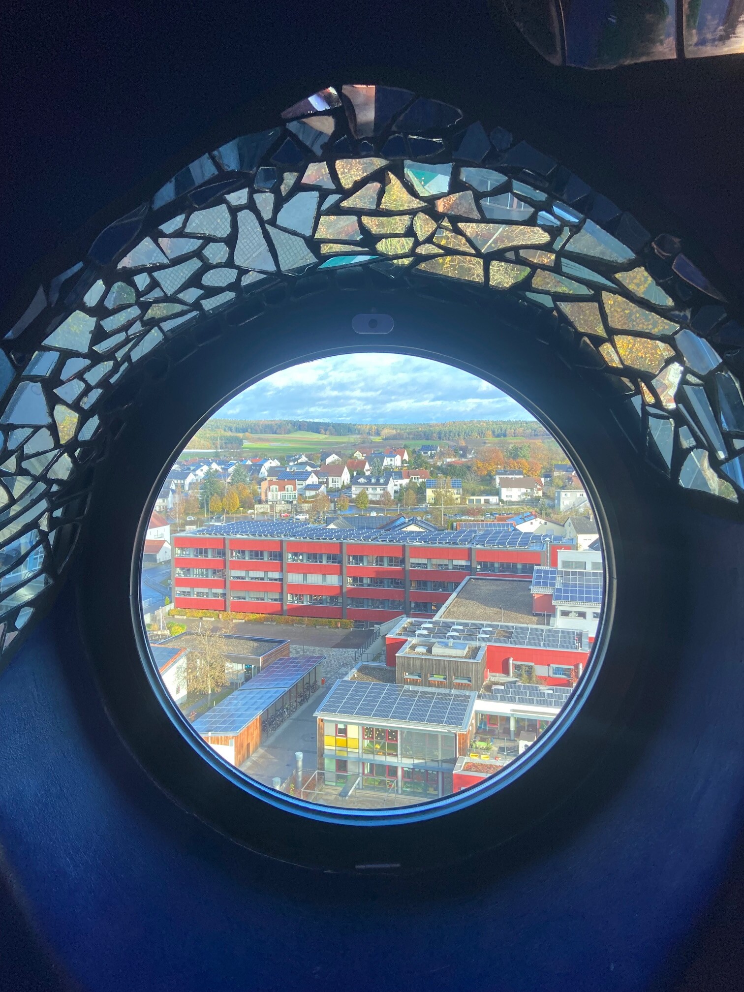Im Foto oben ganz links: Braumeisterin Frau Engleder, rechts: Rektor Wolfgang Brey, Lehrerin Lisa Wilam und Konrektorin Kathrin Kiermeier, daneben die Klasse M8b. In der Galerie ein Blick aus dem Turmfenster und nochmals das Hauptmotiv. Bilder: Lisa Wilam, Emily Schemmel.