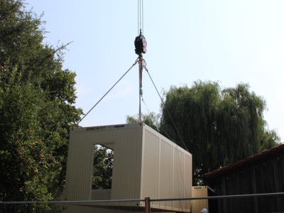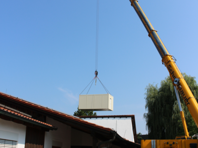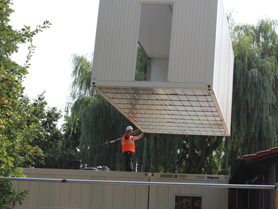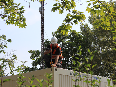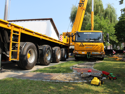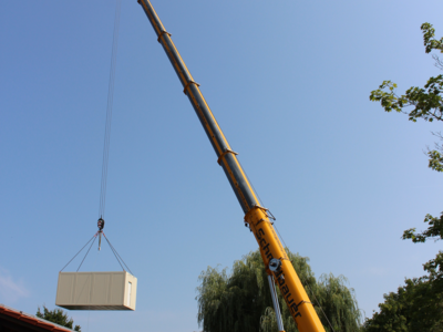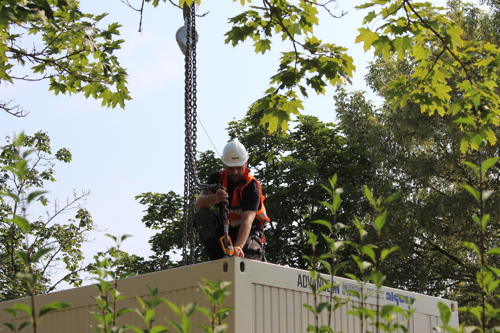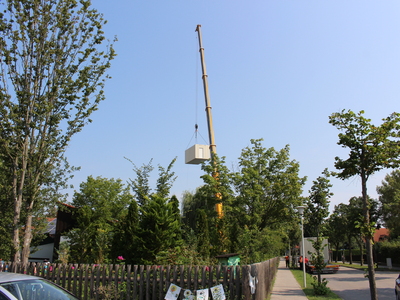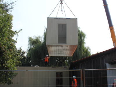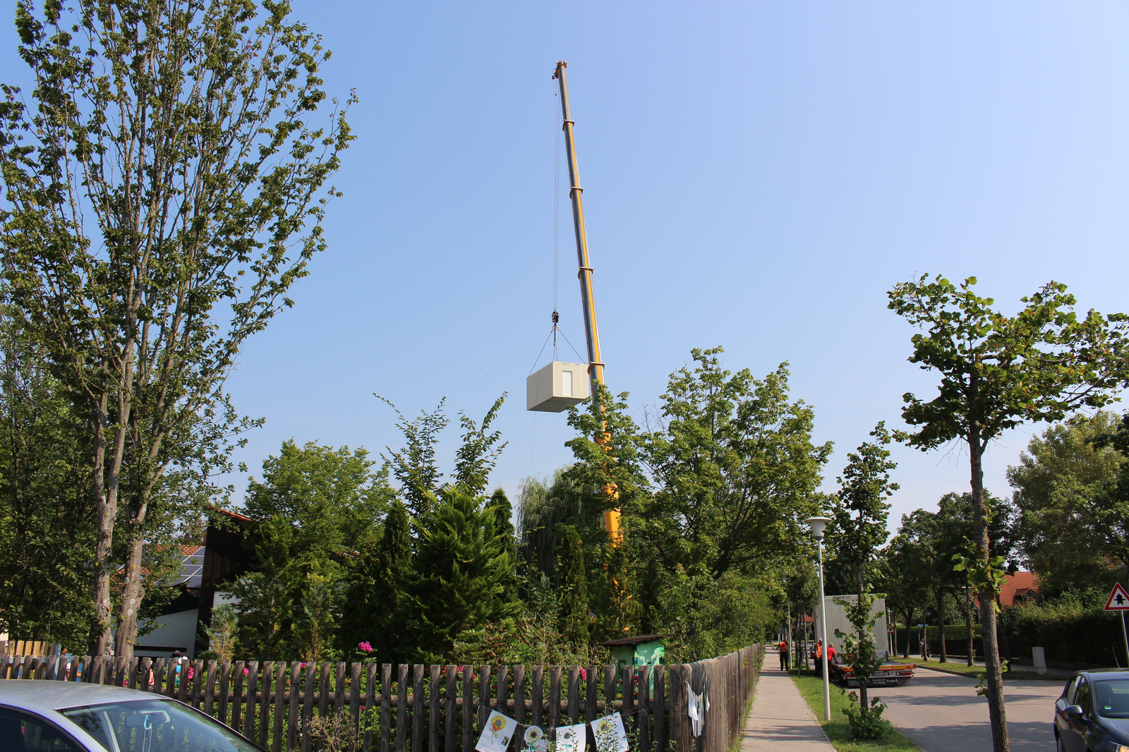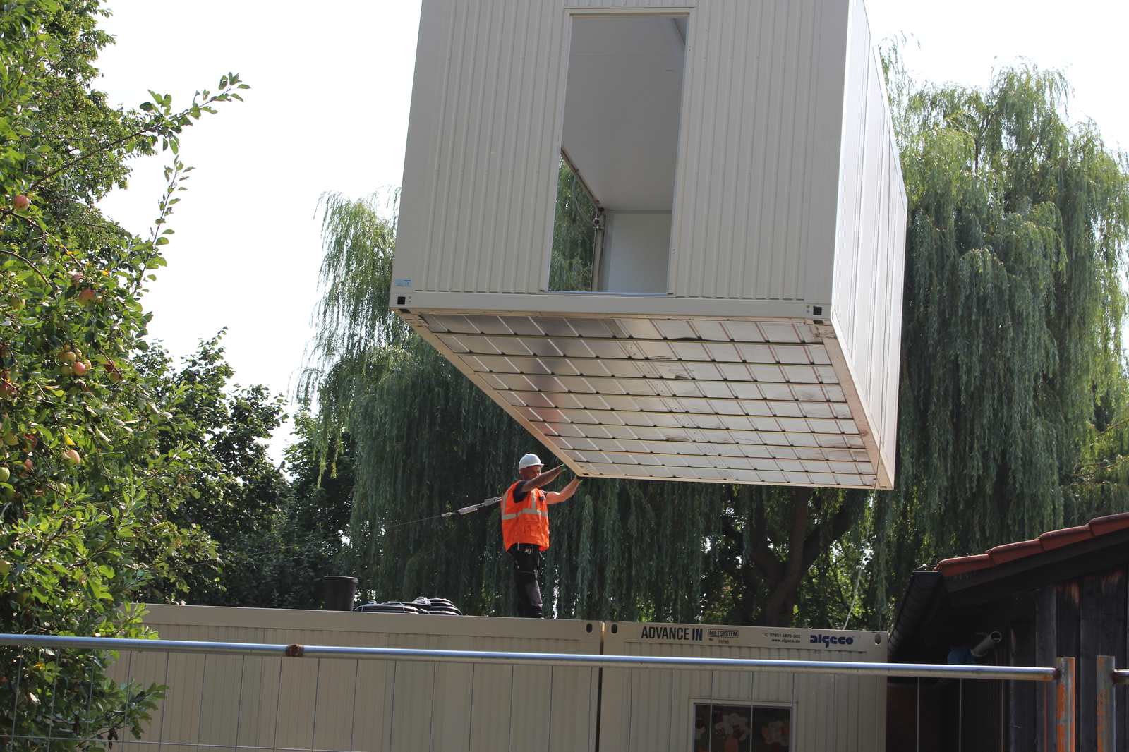 Am Dienstag (11. August 2020) wurden sechs Container auf dem Gelände des Kindergartens Regenbogenland im Erikaweg platziert. Ein Schwerlastkran war nötig, um die Container von der Straße An den Sandwellen über den bestehenden Kindergartenbau zu hieven und in die vorgesehenen Positionen zu bringen.