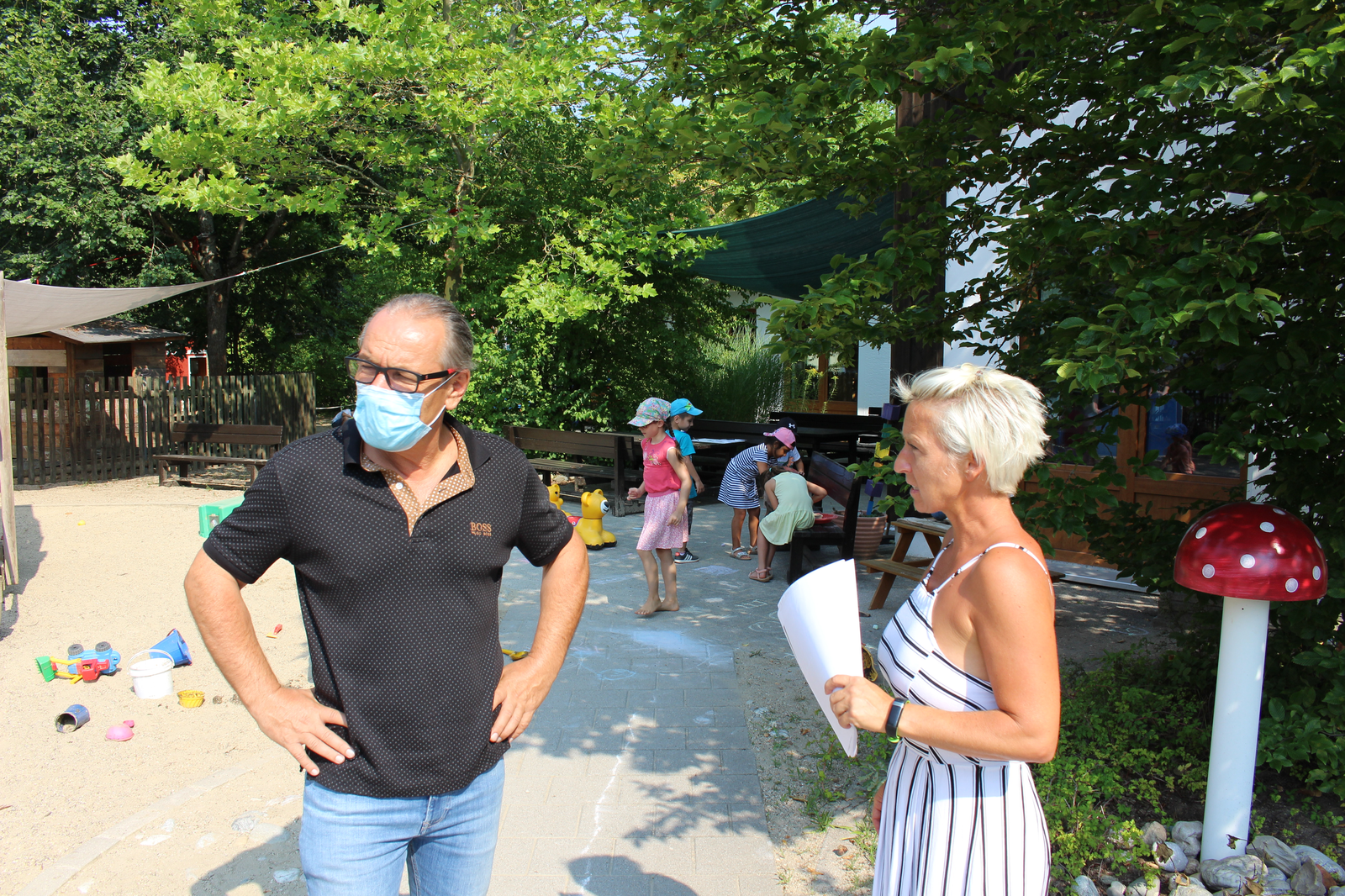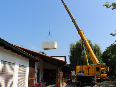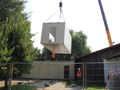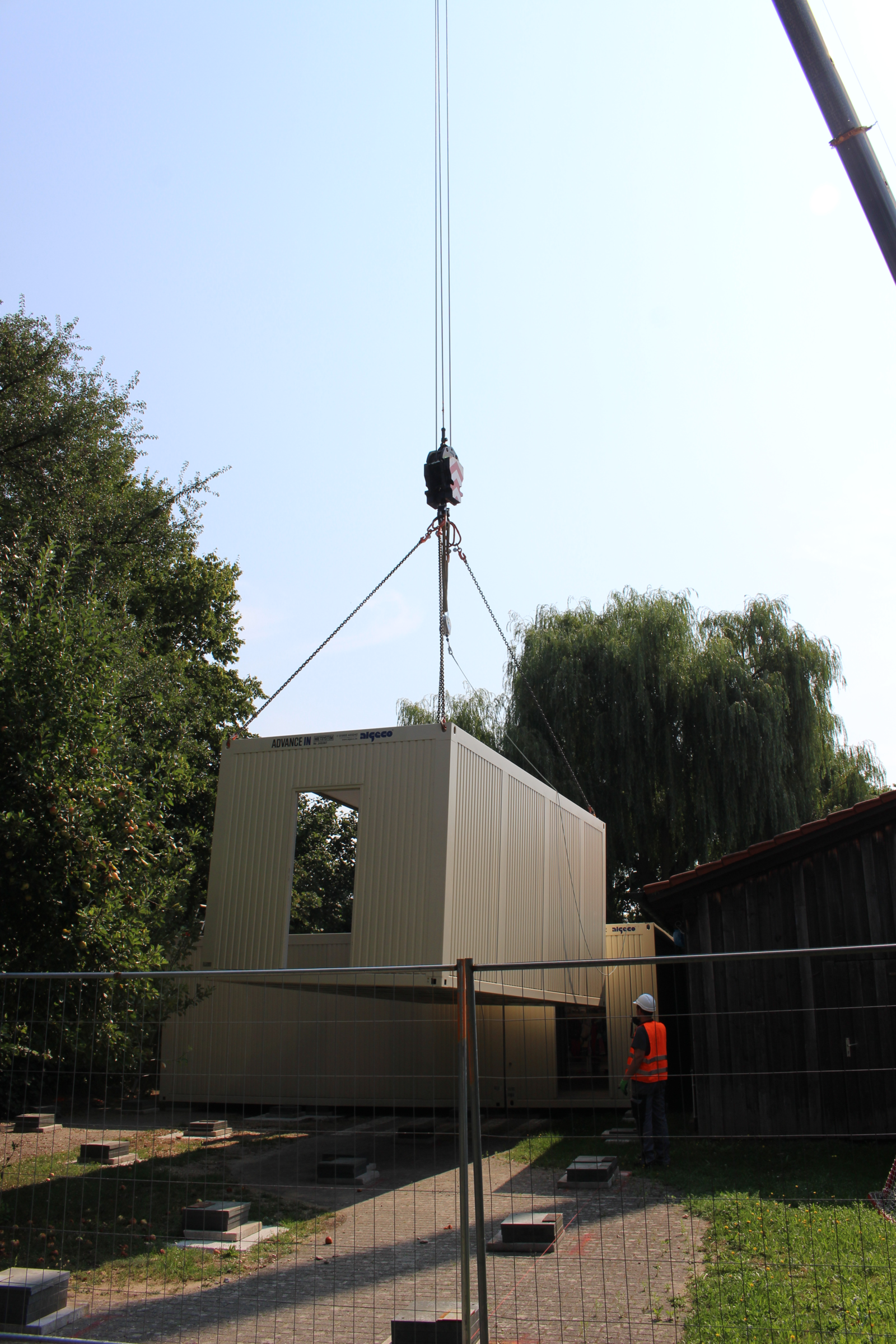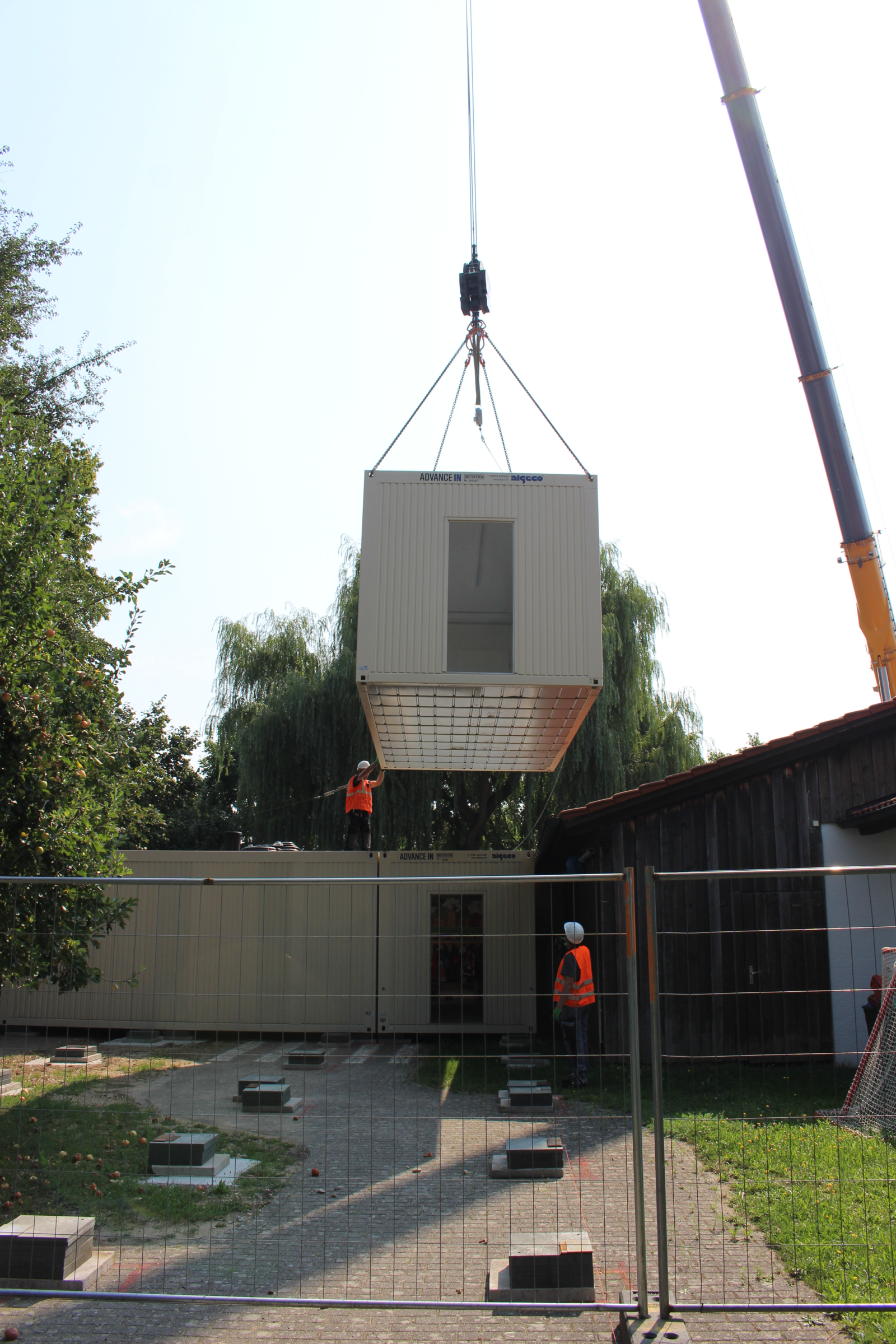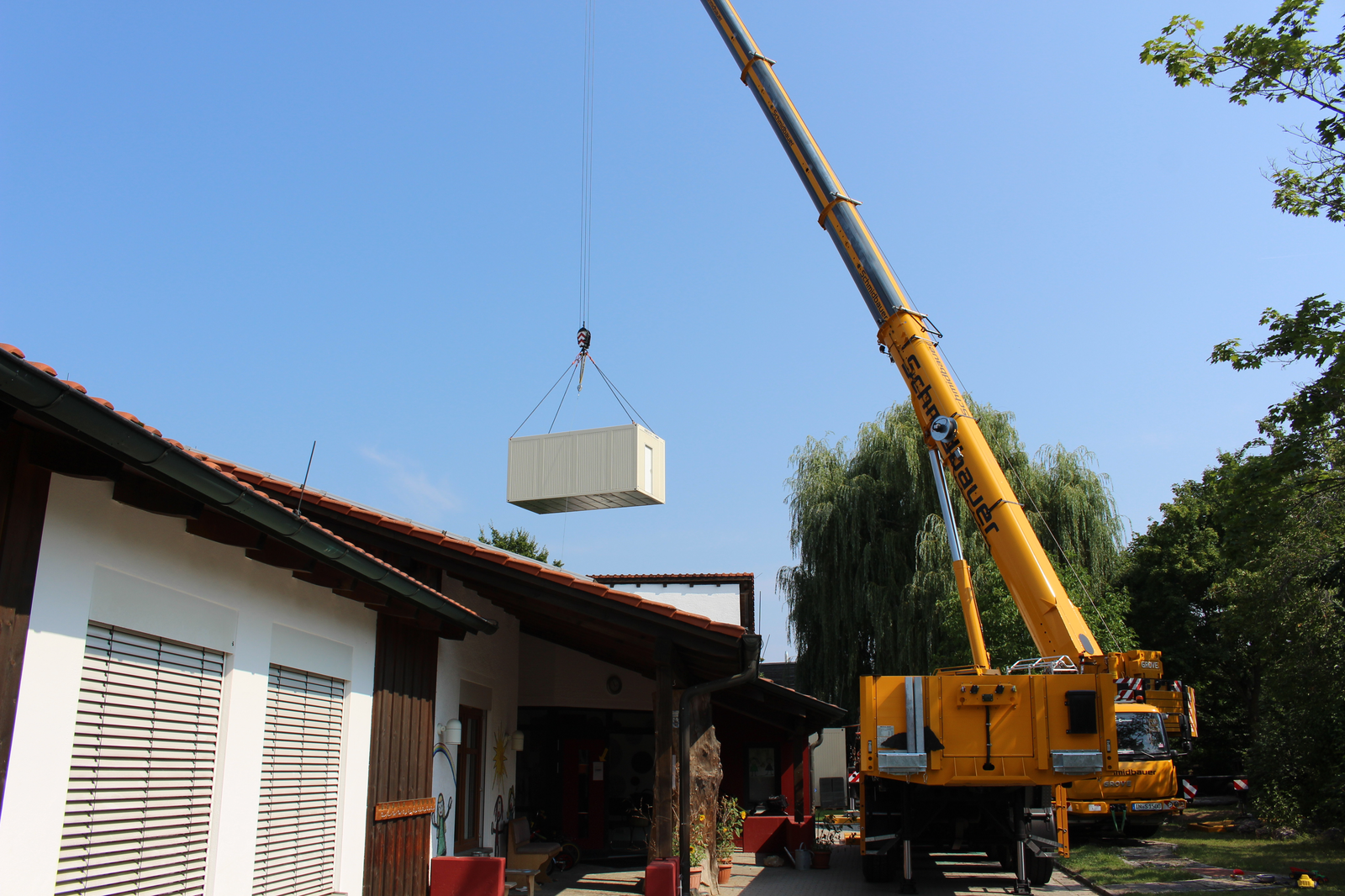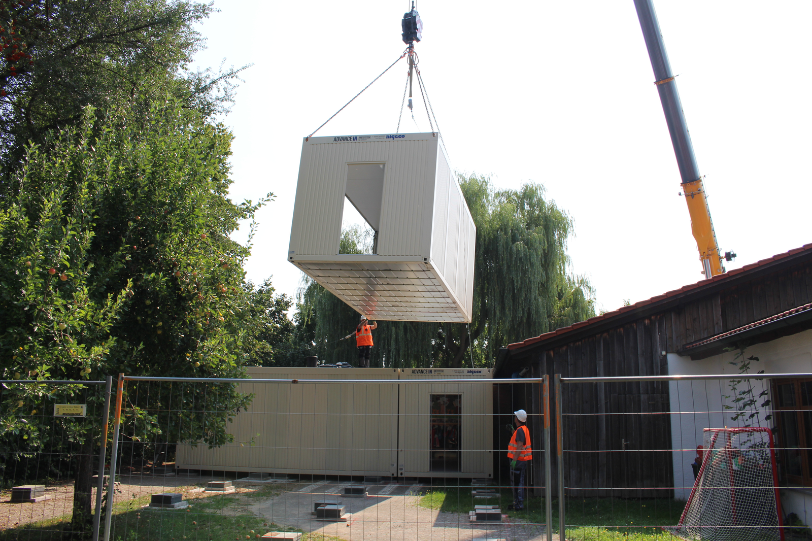 Der Bestandsbau des Kindergartens beherbergt drei Gruppen, im August 2019 wurde mittels Containerlösungen eine weitere Gruppe ermöglicht. Mit dem nun erfolgten Lieferung wird der Kindergarten fünfgruppig.
