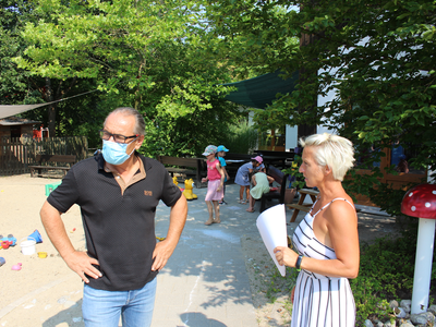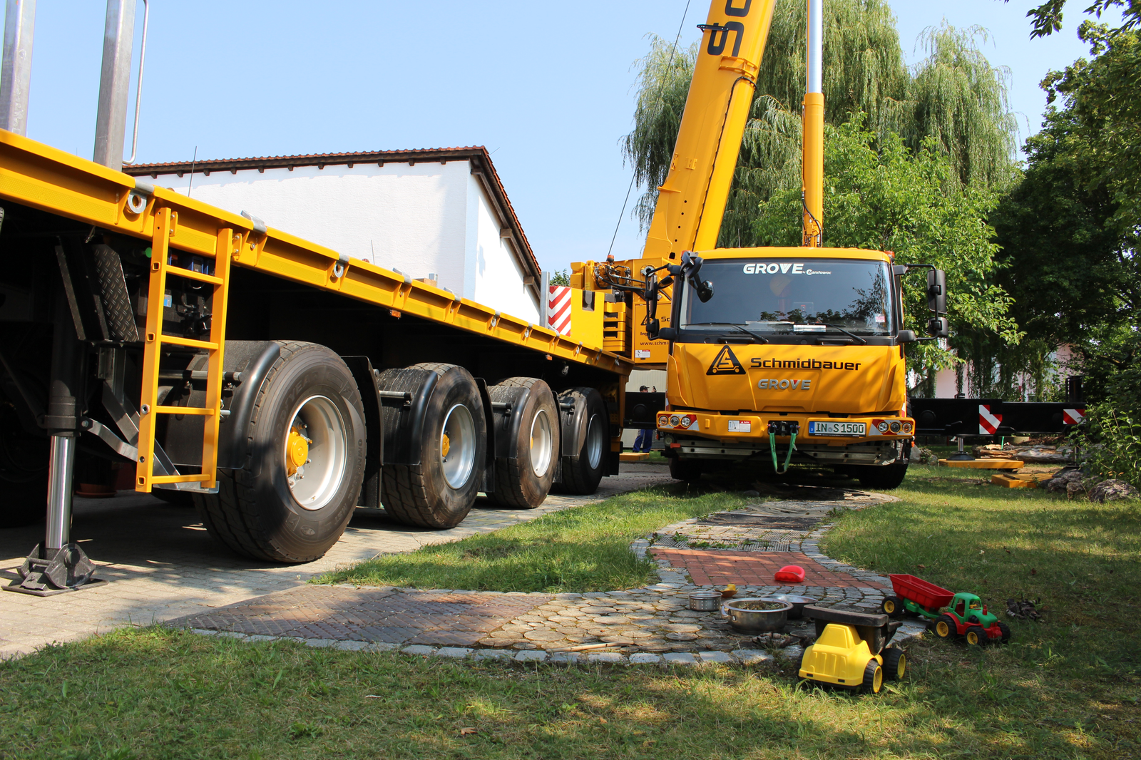 In den Bildern (Ingo Knott, Stadt Abensberg) der Transport der Container; mit dabei: Gerhard Rölz vom Stadtbauamt und Renate Lohr, Erzieherin im Kindergarten Regenbogenland, im Gespräch.