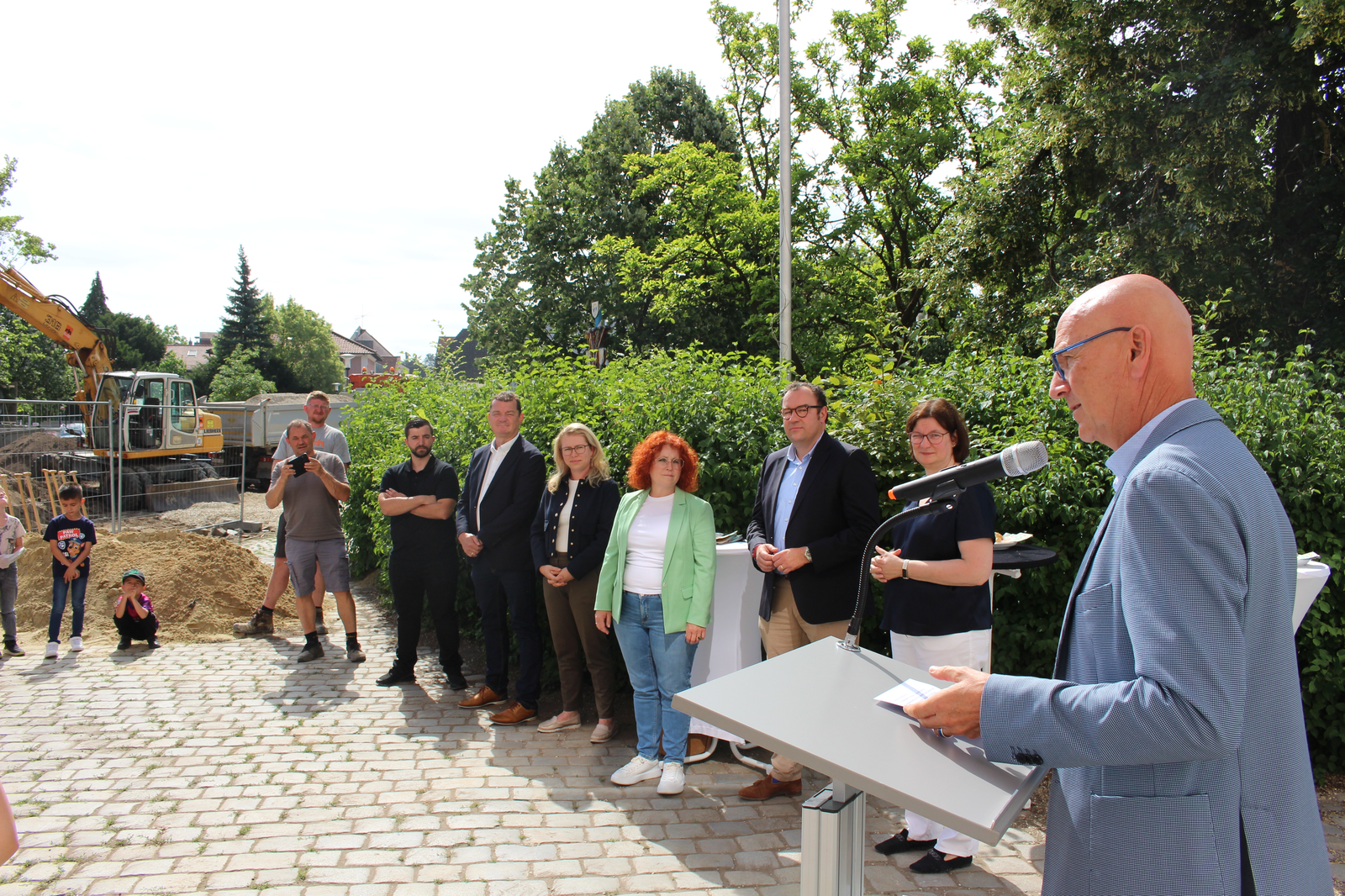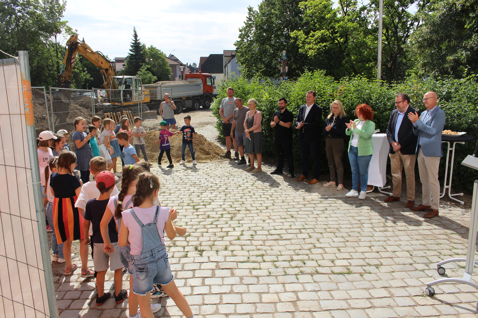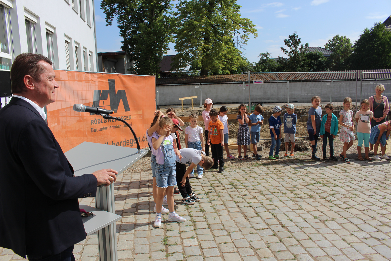 „Wir befinden uns in besten Händen“, so die Rektorin, die sich bei der Stadt Abensberg und beim Schulverband bedankte. Und beim 1. Bürgermeister, der sich stets für Investitionen im Bildungsbereich engagiere. Dr. Uwe Brandl freute sich, dass „dieses Projekt noch in meiner Amtszeit startet“. Er dankte Stadtbaumeister Blerim Syla und Architekt Norbert Raith, der mit Geschäftsführerin Susanne Böhm gekommen war. Raith lobte ausdrücklich die Zusammenarbeit mit der Stadt Abensberg und mit dem Schulverband Abensberg-Biburg. Für die Kinder sei der Spatenstich „ein Meilenstein“, und so griffen die kleinen Leute zu den Spaten.
