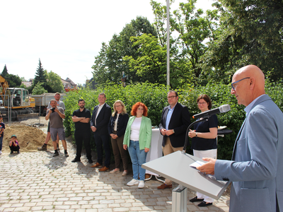 Mit dem Spatenstich zum Aufbau einer Containeranlage startete am Montag (3. Juli) die Generalsanierung und Erweiterung der Grundschule Abensberg. Die Container sind auf Schulbetrieb ausgelegt und sie werden alle auf dem Grundschulgelände an der Römerstraße Platz finden. Mit dem Umbau wird ein neues lernpädagogisches Konzept an der Grundschule einziehen: Lernlandschaften lösen die klassischen Raumstrukturen auf. „Ab heute freuen wir uns auf eine neue Qualität der Wissensvermittlung“, so Rektorin Andrea Brandl am Montag. Mit dabei die Architekten Norbert Raith und Susanne Böhm, Biburgs Bürgermeisterin Bettina Danner, Stadtbaumeister Blerim Syla, Abensbergs 1. Bürgermeister Dr. Uwe Brandl und 2. Bürgermeister Dr. Bernhard Resch.