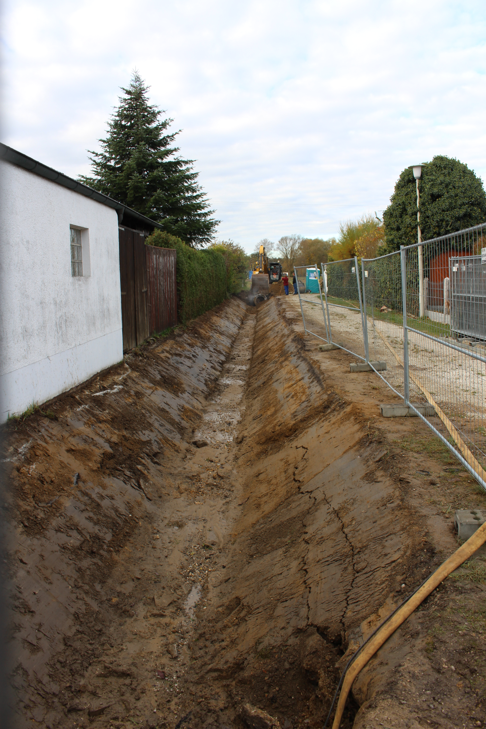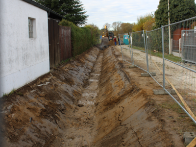 Im Bild oben ein Blick in die Sandstraße und den Graben. In der Galerie der Spatenstich: von links Richard Scheugenpflug vom Ingenieurbüro Ferstl, Abensbergs 1. Bürgermeister Dr. Bernhard Resch, Klärwerkleiter Konrad Ettengruber, Stadtwerkeleiter Dr. Rainer Reschmeier, Erich Wagner und Florian Braun vom Bauunternehmen Fahrner, Stadtrat Reinhard Handschuh und Dr. Christian Thurmaier vom Amt für Ländliche Entwicklung Niederbayern. Foto: Wolfgang Abeltshauser, Mittelbayerische Zeitung. Danach weitere Schnappschüsse von den Bauarbeiten - der Graben ist bereits angelegt. (Diese Fotos: Ingo Knott, Stadt Abensberg.)