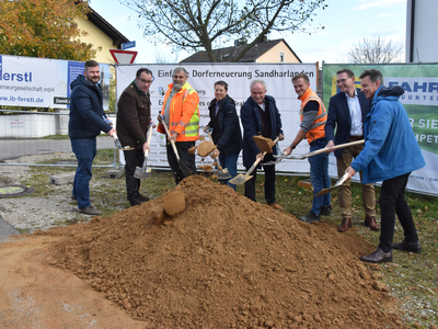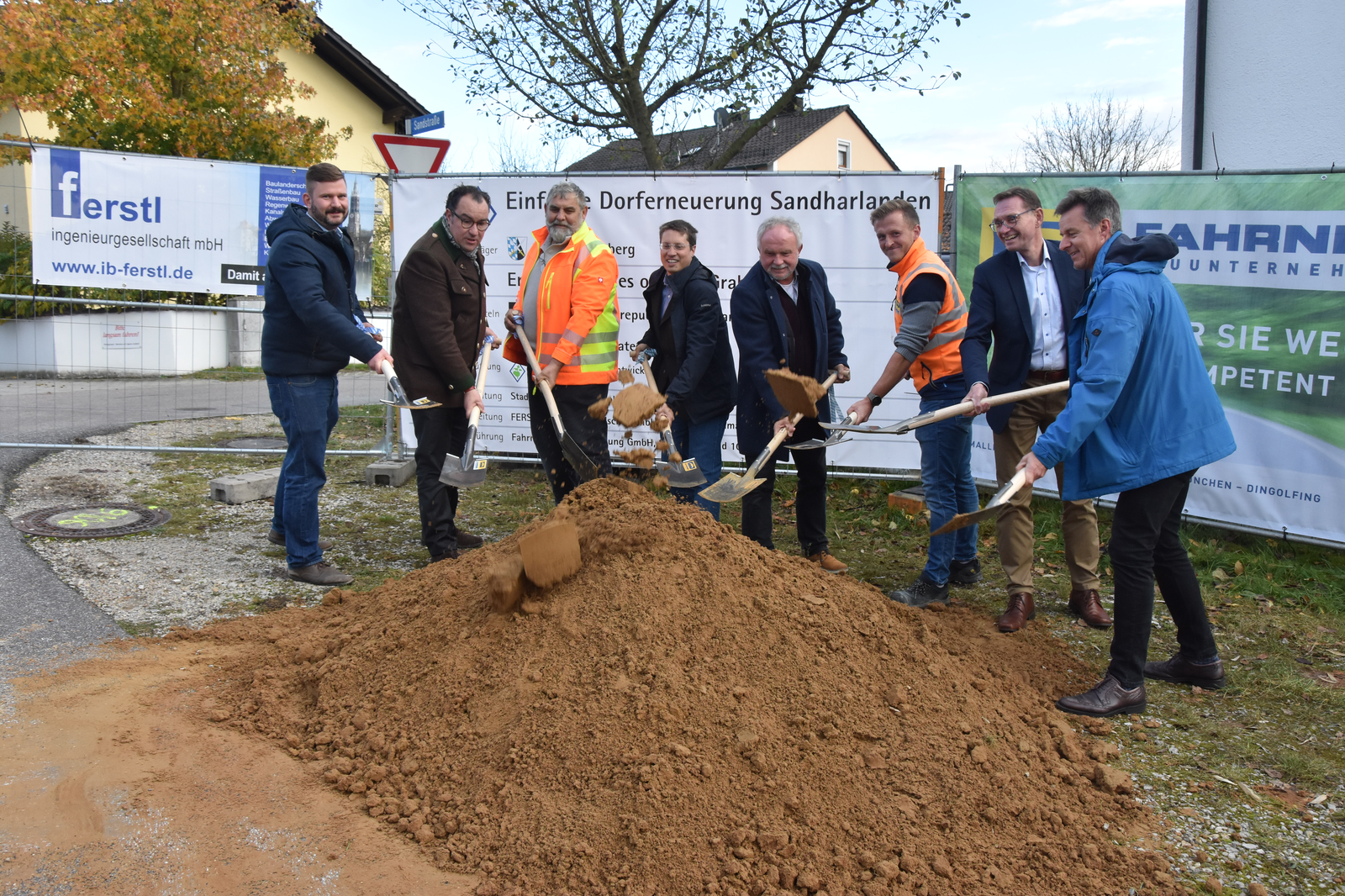 Am Montag (6. November) erfolgte mit dem symbolischen Spatenstich der Start für eine weitere Starkregen-Schutzmaßnahme im Abensberger Ortsteil Sandharlanden. Dabei wird ein Feldweg auf rund 200 Metern verschwinden, ein offener Wassergraben entsteht. Denn nahe der Sandstraße münden mehrere Regenwasserkanäle in ein Kanalrohr. Dieses verläuft unter dem Feldweg und ist – natürlich – in der Durchleitungskapazität begrenzt. Der Feldweg wird verschwinden, der offene Graben wird naturnah angelegt. Das Kanalsystem bis zur Sandstraße selbst wird verstärkt, nach dem offenen Graben werden ebenfalls größere Kanalrohre bis zum Regenrückhaltebecken am Sportplatz eingebaut. Letztere Maßnahme wird 2024 erfolgen und den Abschluss der jahrelangen, umfangreichen Planungen und Arbeiten um den Starkregenschutz Sandharlanden markieren.