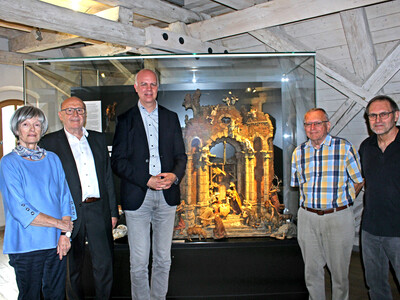 Im Foto oben: (v.l.) Gertraud Schretzlmeier, Martin Neumeyer, Jörg Kirschstein, Peter Hübl und Hans Spitzer vor der Kaiserkrippe im Stadtmuseum.