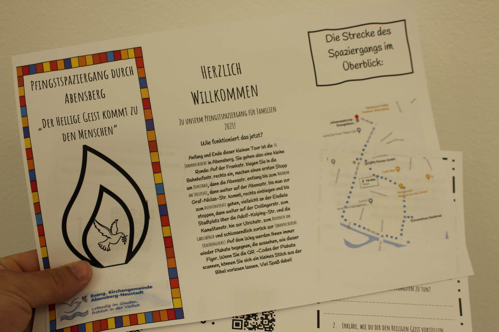 Die evangelische Kirchengemeinde Abensberg-Neustadt hat einen unterhaltsamen und erbaulichen Pfingstspaziergang für Familien vorbereitet - auf der Homepage www.abensberg-evangelisch.de wird dazu ein PDF angeboten, auf dem steht, wie's geht. Anfang und Ende der kleinen Tour ist die evangelische Johanneskirche, von dort geht es zur ersten Station, zum Kunsthaus. Da und an den weiteren Stationen sind Plakate mit QR-Codes aufgehängt; wer diese scannt, der kann sich ein kleines Stück aus der Bibel vorlesen lassen. Darüberhinaus findet in der Johanneskirche am Pfingstsonntag um 10.15 Uhr ein Gottesdienst statt.