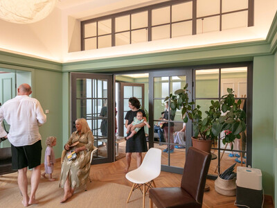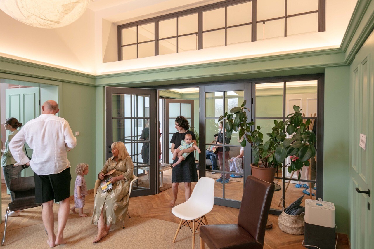 Und im Innern hat sich einiges getan: Im Obergeschoß wurden sechs Wohnungen realisiert, im Erdgeschoß ist die Deutsche Bahn weiterhin als Mieter präsent: Räume für den Fahrdienstleiter, Technik und Schalteranlagen sind nötig. Ebenfalls im Erdgeschoß befindet sich heute die Praxis für Psychotherapie von Frau Dr. Beatrix Eder. Sie nutzt unter anderem die ehemalige Wartehalle - diese wurde mit Bauherr Zeilbeck und dem Planungsbüro von Christine Harnest und ihrer Mitarbeiterin Michaela Süßmilch in eine moderne Praxis umgebaut; auch sie war beim Tag der offenen Tür anwesend und freute sich über reichlich Zuspruch. Die architektonische Transformation wurde bereits mehrfach prämiert und findet sich als Referenz inzwischen in mehreren Publikationen; vom Handbuch der Innenarchitektur („Best of Interieur“, Callwey-Verlag) bis zum Coffee Table Book. Auch bei den „Iconic Awards“ des Deutschen Rats für Formgebung wurde die Umgestaltung aufgenommen.