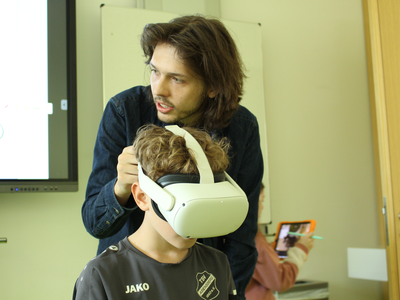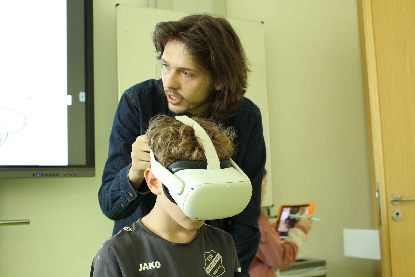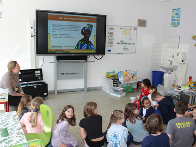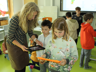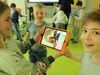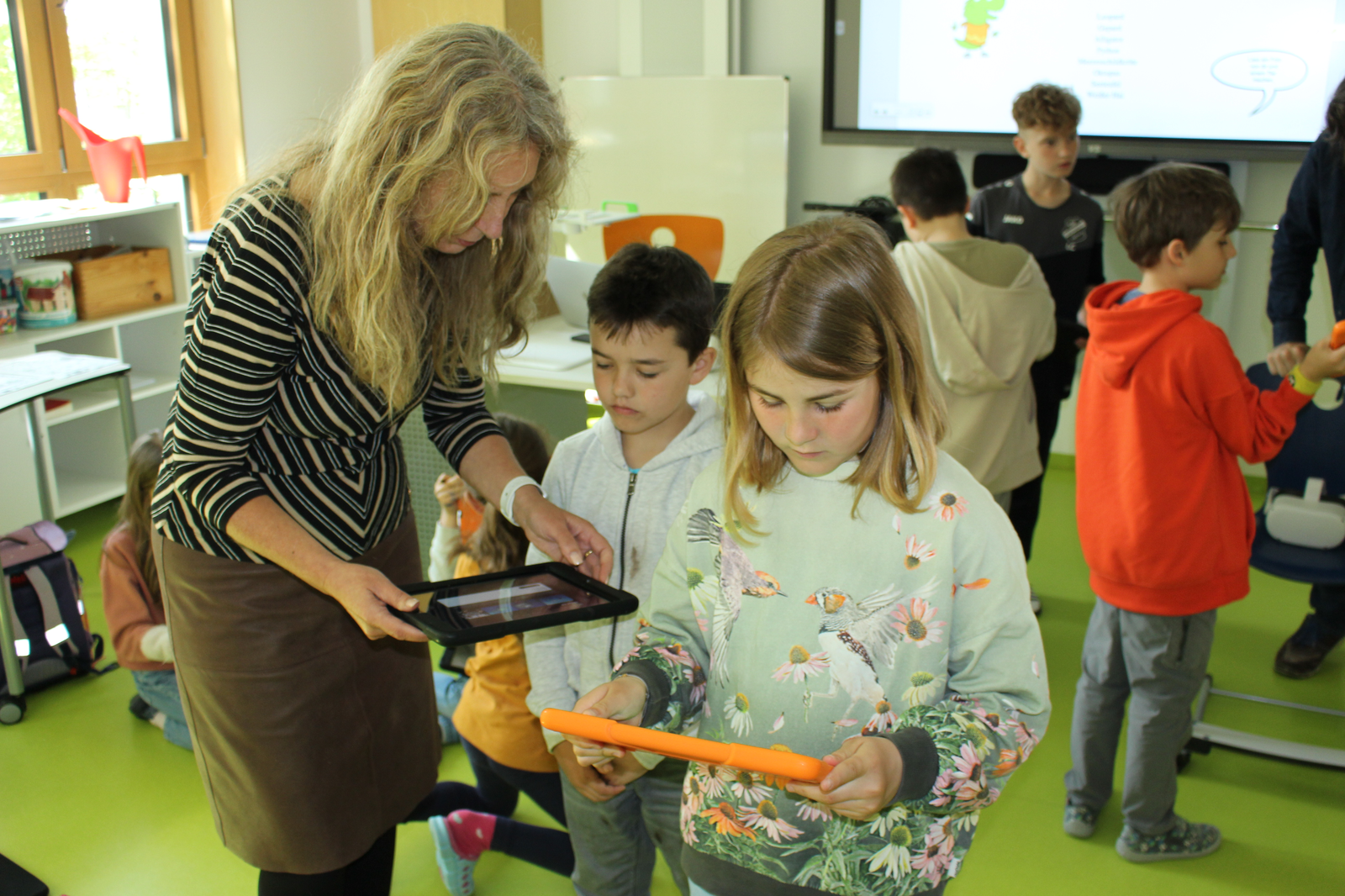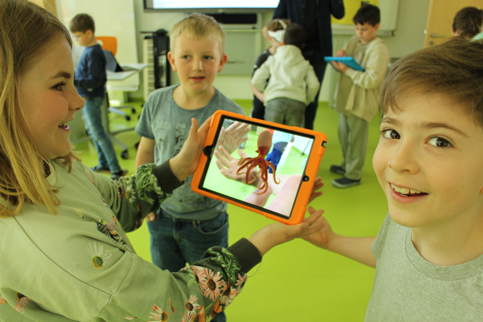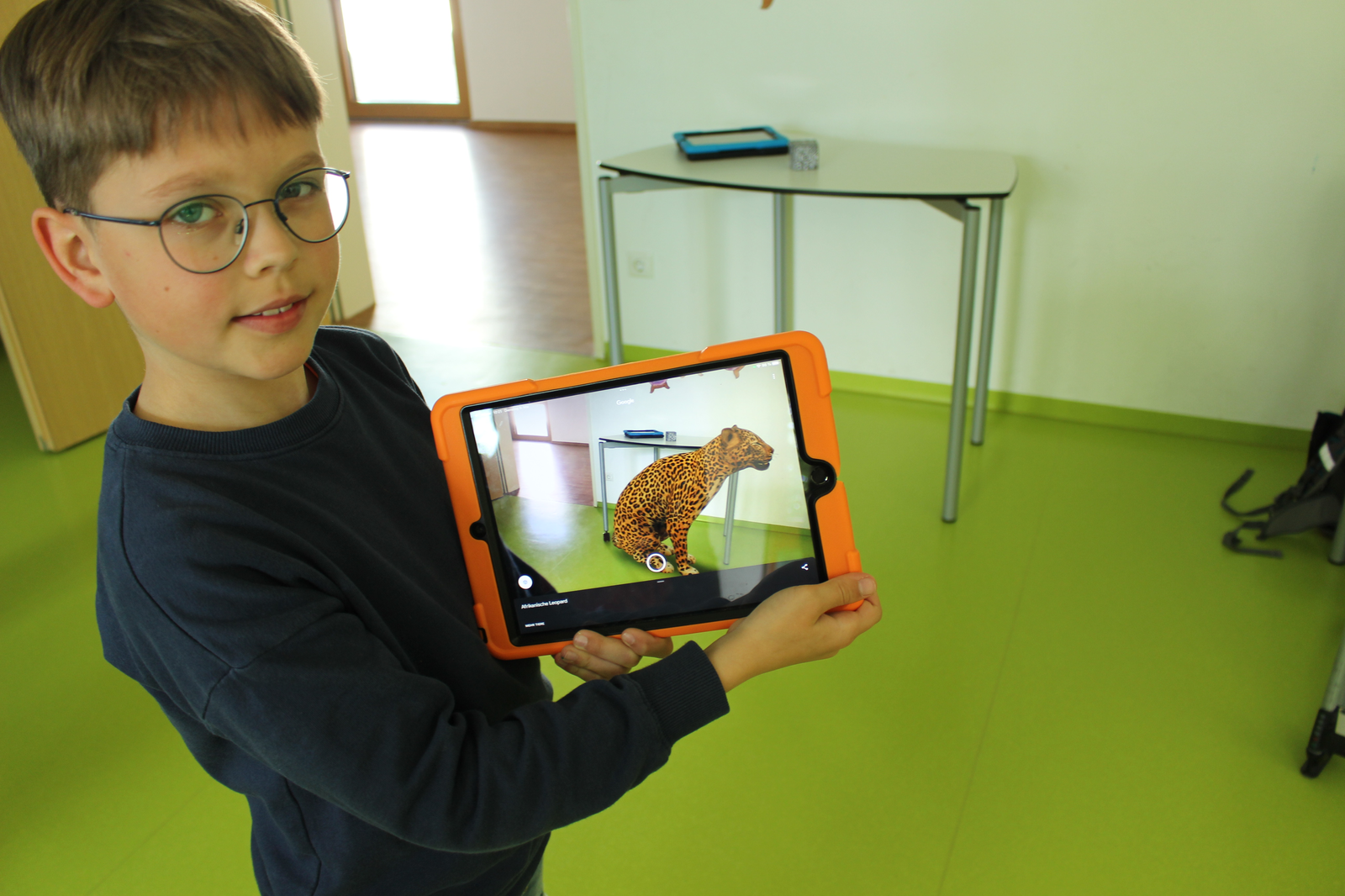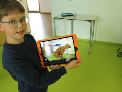 Ein ausgewachsener Leopard im Klassenzimmer? Ein kleiner, roter Oktopus in der Hand eines Schülers? – Nicht ganz: die exotischen Tiere bewegen sich in der virtuellen Welt, sind also lediglich am Bildschirm sichtbar. Der Eindruck ist aber gigantisch und Liane Köppl, Rektorin der Grundschule Offenstetten, hat alle Hände voll zu tun, die Fragen der begeisterten Schülerinnen und Schüler zu regeln. Die sind mitten in der Projektwoche „Afrika“ und wählen die Tiere aus, die sie auf den Bildschirmen ihrer Tablets zum virtuellen Leben erwecken. Einige Räume weiter wird gebastelt und entworfen; „Be an african designer“ heißt hier das Motto und die Schülerinnen und Schüler lernen Mode und Schmuck vom afrikanischen Kontinent kennen. Sie kreieren ein Armband oder landestypische Kleidungsstücke. Insgesamt 16 Workshops und 20 Wissens-und Mitmach-Stationen sind es, die in der Projektwoche an der Grundschule Offenstetten angeboten werden.
