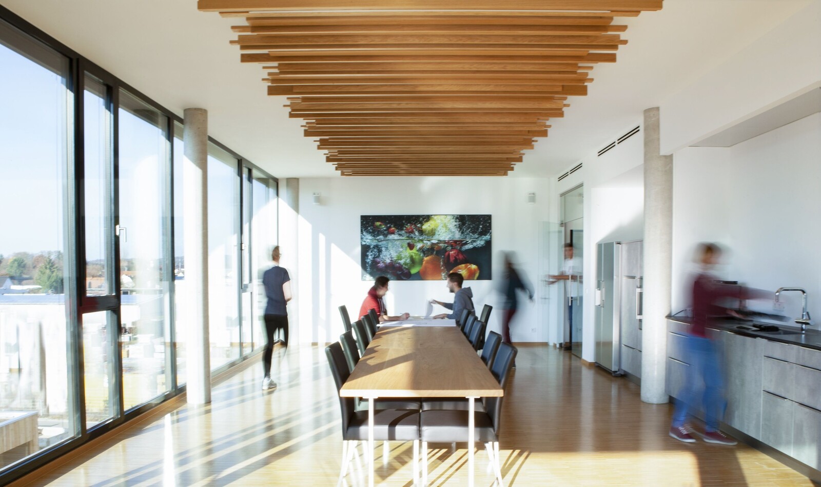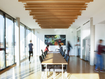 Neben ergonomischen Aspekten war der verantwortungsvolle Umgang mit Energieressourcen ein wesentlicher Aspekt bei der Büroplanung. Die Beleuchtung wird über Anwesenheitssensoren automisch so gedimmt, dass das nötige Kunstlicht zum Tageslicht für optimale Lichtverhältnisse hinzugemischt wird. Das Objekt geht am Abend bei Abwesenheit automatisch in den „Schlafmodus“, während sich die Überwachungssysteme aktivieren. Es ist für Reinhard Zott ein super Gefühl, wenn das Objekt im Sommer energieneutral gekühlt wird und ein Großteil des Stromverbrauchs von der PV-Anlage auf dem Dach kommt. Aktuell wird die Auslegung des Batteriespeichers untersucht. Die Erfahrungen mit dem Elektro-Poolfahrzeug sind hierfür sehr wertvoll.