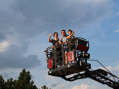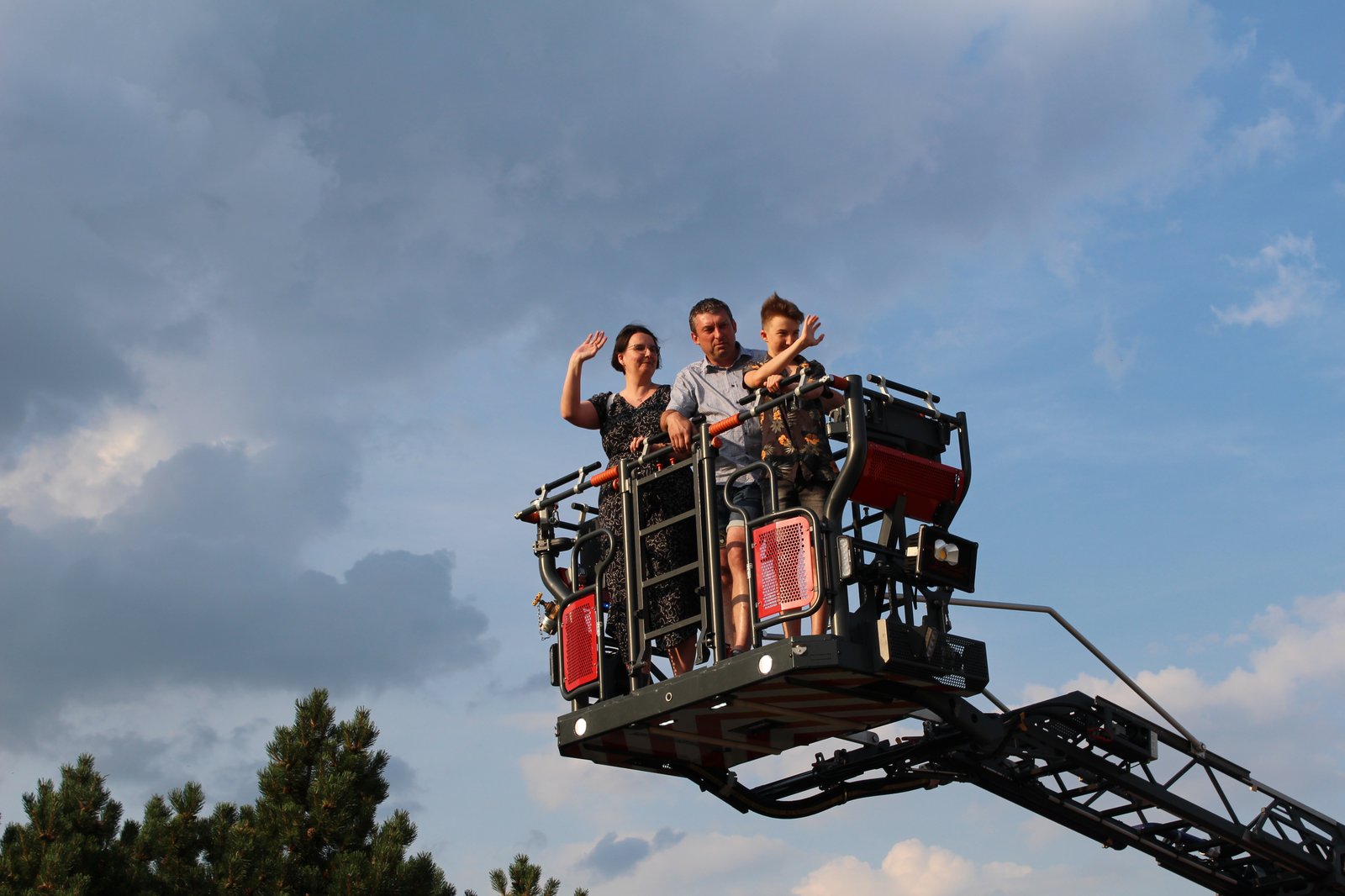 Im Vorfeld hatten die Floriansjünger die Abensberger Feuerwehr gebeten, sie bei diesem Vorhaben mit ihrer Drehleiter zu unterstützen. Doch als diese kurzfristig absagte, war guter Rat teuer. Doch ein Anruf bei den Kameraden in Neustadt genügte. Kommandant Jürgen Bucher sagte sofort zu und schickte seinen Sohn Marcel auf den Weg nach Offenstetten. Als die Drehleiter, eingerahmt von den beiden Fahrzeugen der Offenstettener Wehr, vor Mirlachs Haus am Sommerkeller mit Blaulicht eintrafen und noch kurz die Sirenen einschalteten, war für Andreas die Überraschung groß. Und dann hieß es einsteigen in den Korb und Marcel Bucher fuhr die Familie in die Höhe. Oben gab es bei schönem Sonnenschein eine gute Aussicht in alle Himmelsrichtungen.