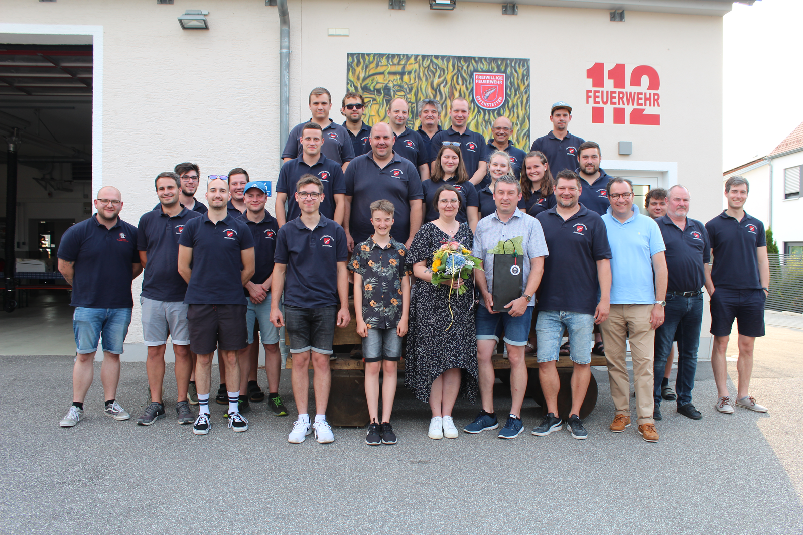 Anschließend trafen sich viele Feuerwehrkameraden am Gerätehaus. 2. Bürgermeister Bernhard Resch dankte Mirlach für seinen langjährigen Einsatz und überreichte ein Präsent der Stadt. Kommandant Stefan Lanzl ließ die langjährige Zusammenarbeit Revue passieren und zeigte so manches herausragende Ereignis auf. Den Lobes- und Dankesworten schloss sich auch der Vorsitzende des Feuerwehrvereins Wolfgang Huber an. Andreas Mirlach bedankte sich sichtlich gerührt für diese schöne Überraschung. Er wird die Offenstettener Feuerwehr auch weiterhin in verschiedenen Funktionen unterstützen. Sein designierter Nachfolger ist Thomas Resch. Im Anschluss an den offiziellen Teil blieb man noch lange in geselliger Runde beisammen.