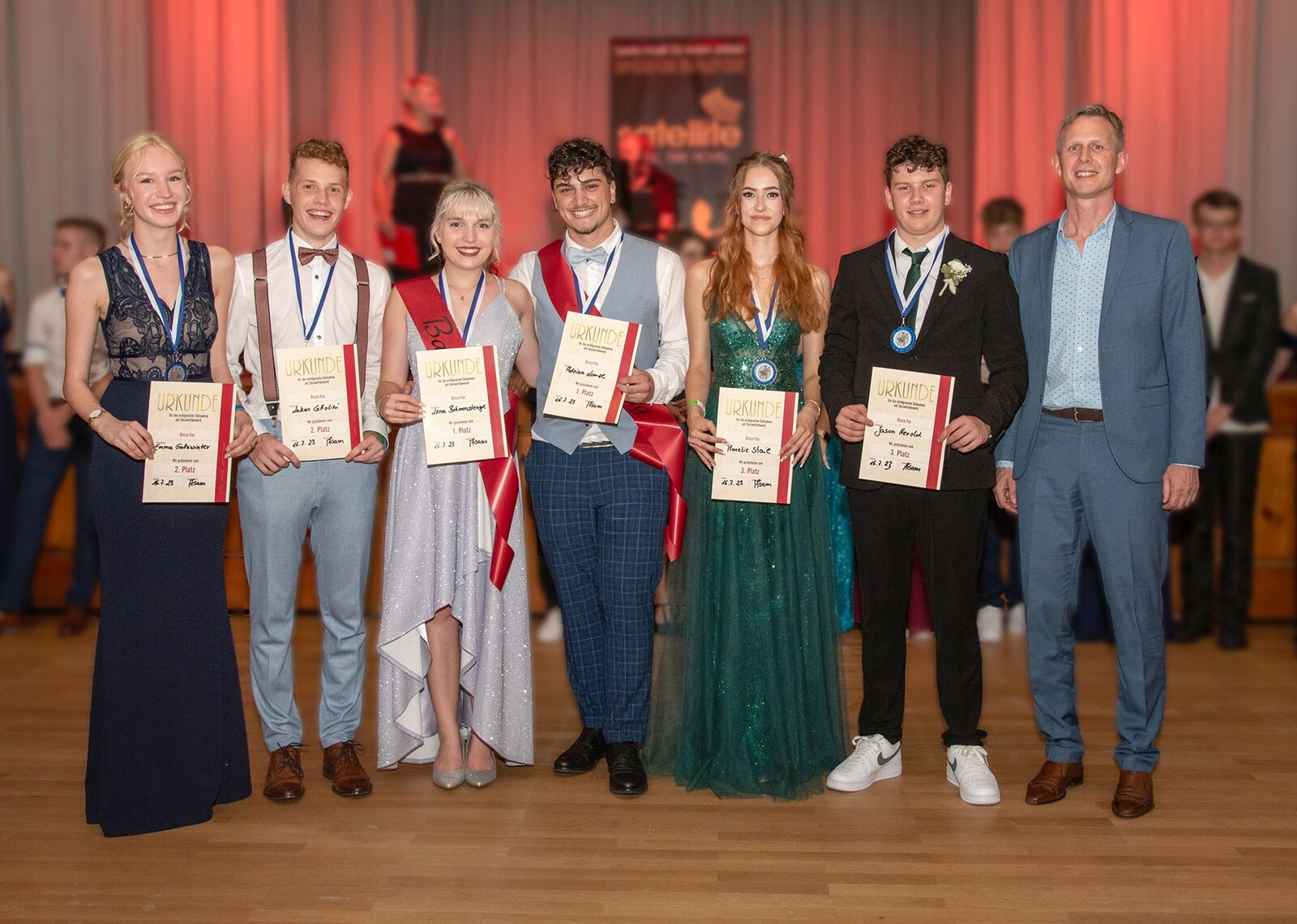 Der Bürgersaal in Neustadt an der Donau war mit vielen Tanzbegeisterten sehr gut besucht. In diesem festlichen Saal fühlten sich alle Beteiligten sehr wohl: die Schülerinnen und Schüler in elegantem Outfit, die Eltern und Verwandten in festlichen Roben, genauso die Lehrerinnen und Lehrer. Die Band „Satellite“ spielte wunderbare Tanzmusik und lud zur späteren Stunde noch zu einer fetzigen Partyrunde ein. Dabei führte Nicole Asam durch das abwechslungsreiche Programm. Den ganzen Abend wurde fleißig getanzt und so manches Elternteil bewunderte die Tanzkünste seines Kindes. In nur einer Woche hatten die Schülerinnen und Schüler nicht nur die wichtigsten Tänze mit tollen Figuren einstudiert, sondern eröffneten den Ball sogar mit einem choreografisch umgesetzten Wiener Walzer, der alle Gäste ins Staunen versetzte.