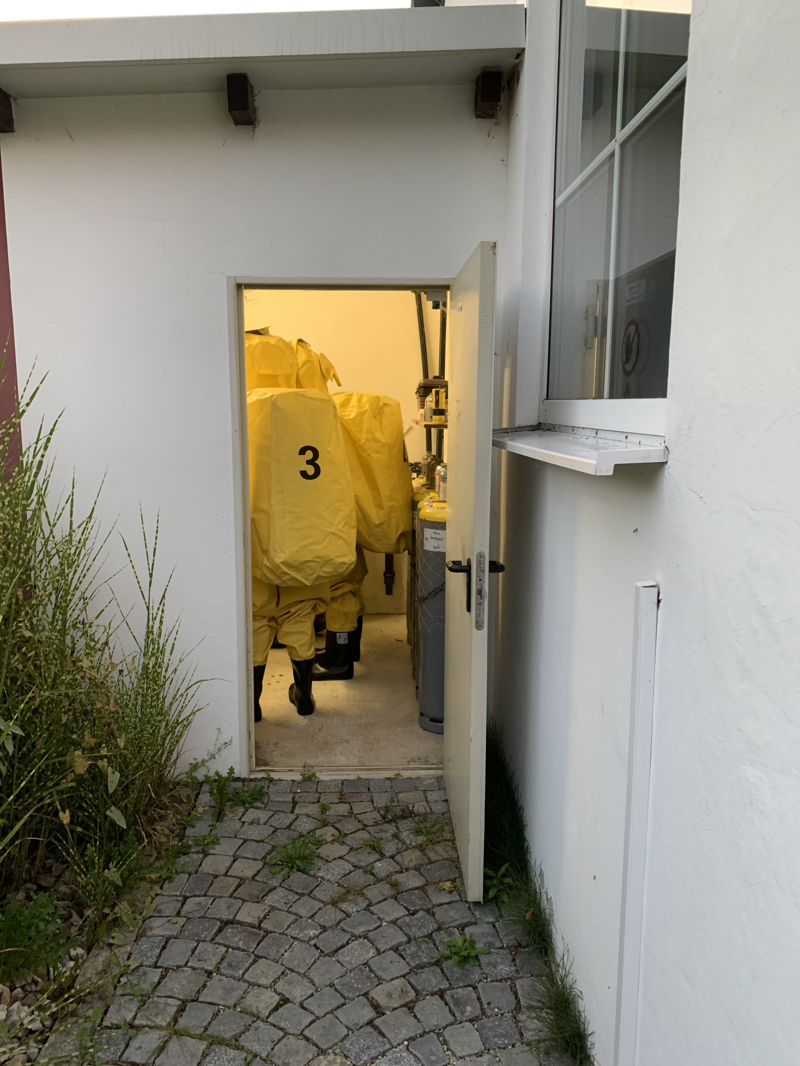 Nach dieser Maßnahme ist eine vollständige Dekontamination notwendig, die in mehreren Stufen erfolgt. Dies ist mit wasserdichten Spezialfolien auf dem Boden in den Farben rot, gelb und grün dargestellt. Dabei wird darauf geachtet, dass das kontaminierte Wasser nicht in die Umwelt gelangt. Im Rahmen dieser Übung konnte das Wasser natürlich problemlos einfach ablaufen, da keine Verunreinigung vorlag. In der Praxis müsste eine Spezialfirma das kontaminierte Wasser entsorgen. Nicht zu unterschätzen ist auch die Beleuchtung, auch das wurde geübt.