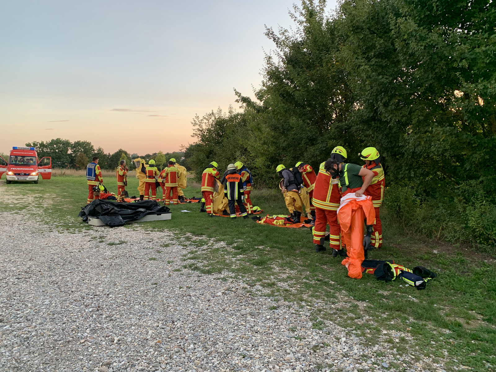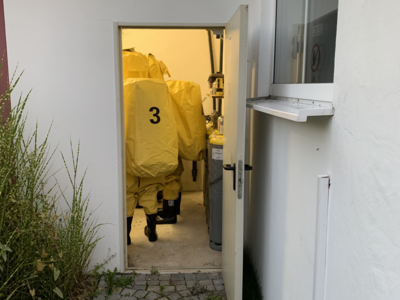 Die Feuerwehr Abensberg hat am 12. September 2022 den Fall eines Chlorgasaustritts im Freibad geübt. Hierfür wurde geübt, was alles zu erledigen ist, sollte es tatsächlich zum Ernstfall kommen. Der erste Schritt ist dabei, mit Atemschutz und in Spezialanzügen die Quelle des Chlorgasaustritts zu beseitigen. Hierzu werden alle Chlorgasflaschen verschlossen und mit einer Schutzkappe gesichert. Dies ist mit dem doch recht unhandlichen Anzug schwieriger als auf den ersten Blick zu vermuten. Auch bieten die Anzüge nur eine begrenzte Zeit Sicherheit, es steht also nur begrenzte Arbeitszeit zur Verfügung.