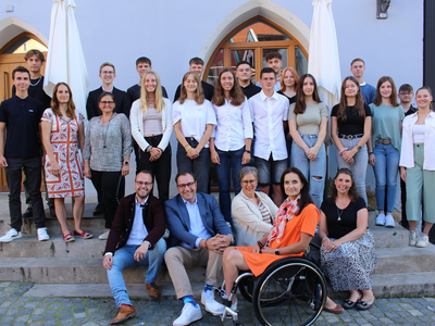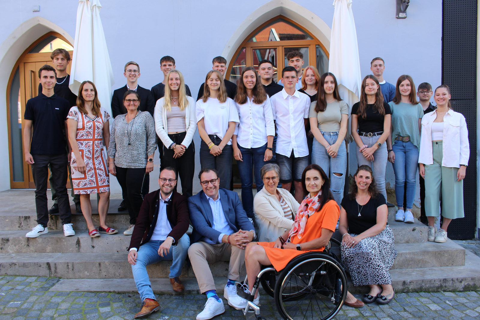 Im Bild oben die erschienenen Schülerinnen und Schüler auf den Treppen zum Rathaus am Stadtplatz in Abensberg. Untere Reihe: Jugendreferent Niklas Neumeyer, 2. Bürgermeister Dr. Bernhard Resch, Bildungsreferentin Dagmar Kellner, 3. Bürgermeisterin Marion Huber-Schallner und Carina Junker von der Stadtverwaltung Abensberg.