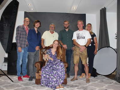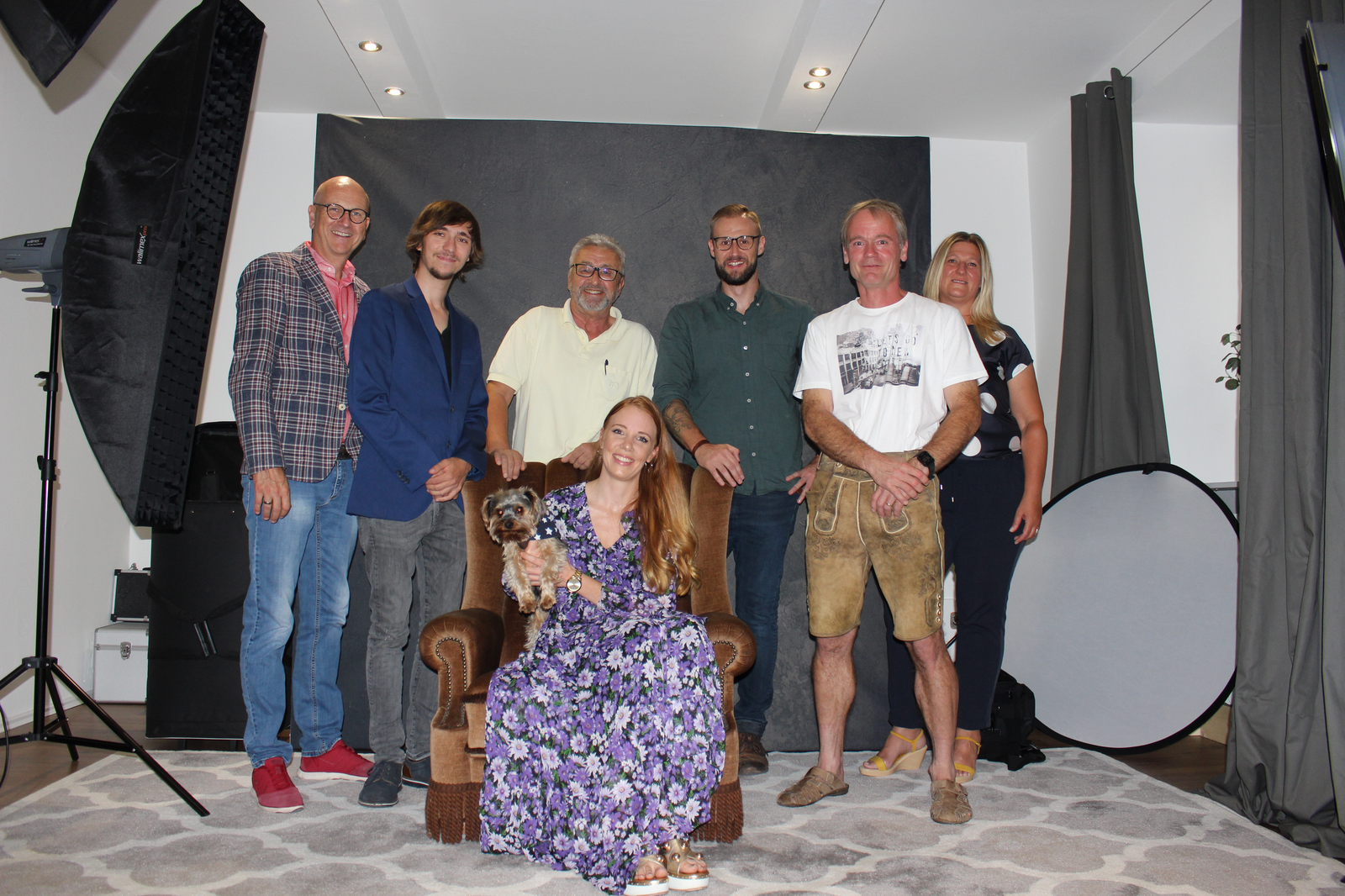 Im Hauptbild oben von links: Abensbergs 1. Bürgermeister Dr. Uwe Brandl, Daniel Kelly, Siegfried Brandmeier, Matthias Brandmeier, Robert Neumaier und Diana Vierthaler. Vorne sitzend Nane Weich mit Louie, dem Yorkshire-Terrier des Paars. (Aufnahme nochmals am Ende der Galerie.)