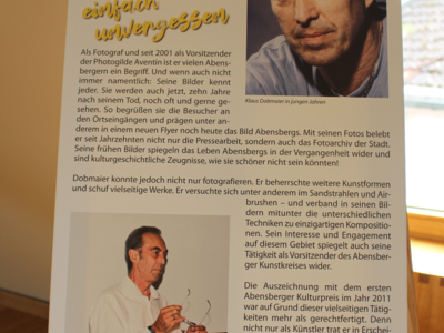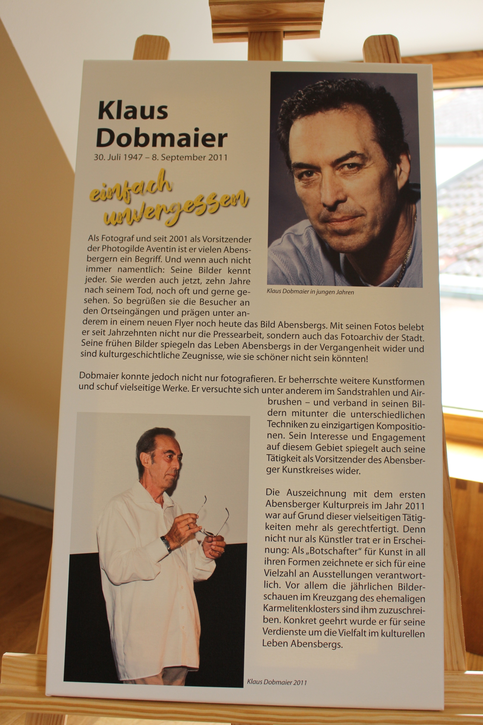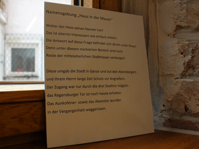Im Foto oben ein Blick vom Foyer in das Künstleratelier, das künftig für kulturelle und touristische Veranstaltungen zur Verfügung steht. Im ersten Bild der Galerie die Einweihung (mit v. li. Museumsleiterin Veronika Leikauf, Stadtplanerin Sonja Schröter, Pfarrer Georg Birner, Ursula Prohaska von der evangelischen Gemeinde, 1. Bürgermeister Dr. Uwe Brandl und 2. Bürgermeister Dr. Bernhard Resch), Weiter in der Galerie die Ansicht des Kunst- und Kulturhauses vom Stadtgraben aus. Dann Impressionen der Räumlichkeiten, auch mit den im September ausgestellten Werken des 2011 verstorbenen Abensberger Künstlers Klaus Dobmaier. Danach eine kurze Erklärung, warum das Haus als Haus in der Mauer bezeichnet wird und nochmals das Hauptbild.