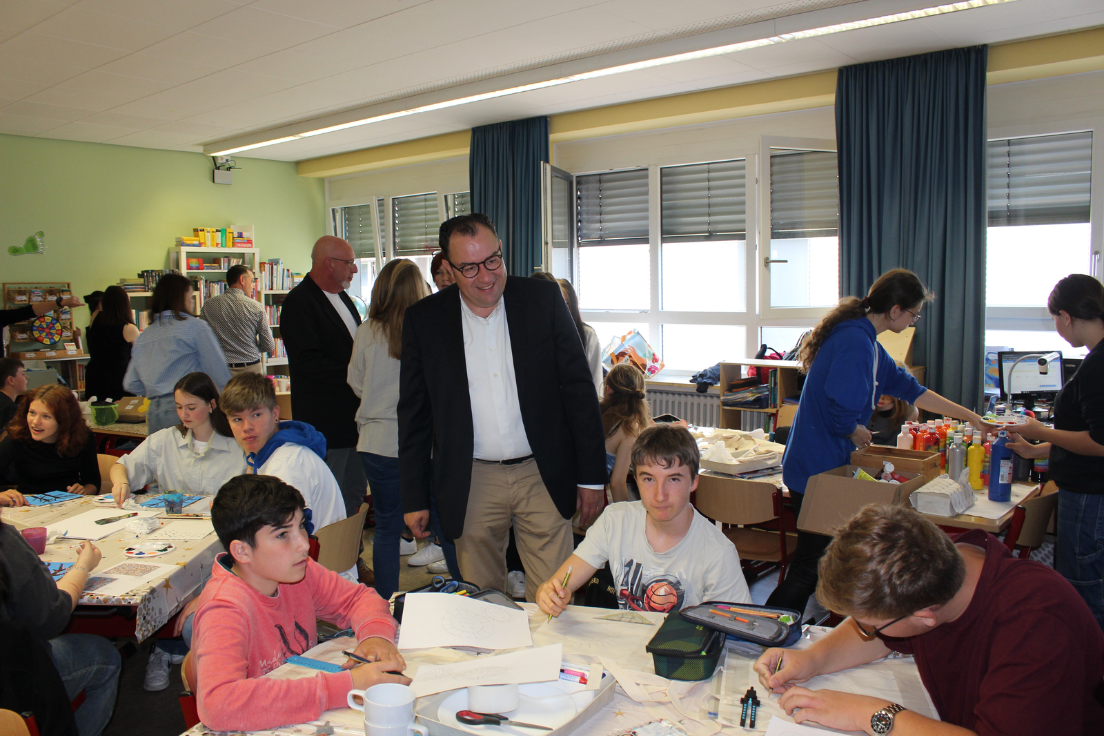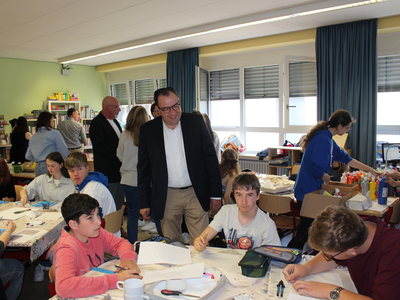 Die Verantwortlichen dahinter – Rektor Wolfgang Brey von der Mittelschule und 1. Bürgermeister Dr. Bernhard Resch, der Gesamtleiter des Cabrinizentrums Stefan Seehofer und Cabrini-Schulleiter Josef Schirm – waren voll des Lobes für die Aktion und schauten den Kunstbegeisterten gerne über die Schultern. Zeichnungen auf verschiedenen Unterlagen, Gipsfigürchen, Schmuck, verzierte Tassen und vieles mehr ist am Mittwoch entstanden. „Ein Mädchen hat mir gesagt, sie hat daheim geübt, damit viel Geld für andere Kinder zusammenkommt“, so Klassenlehrerin Sußebach.