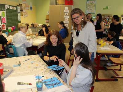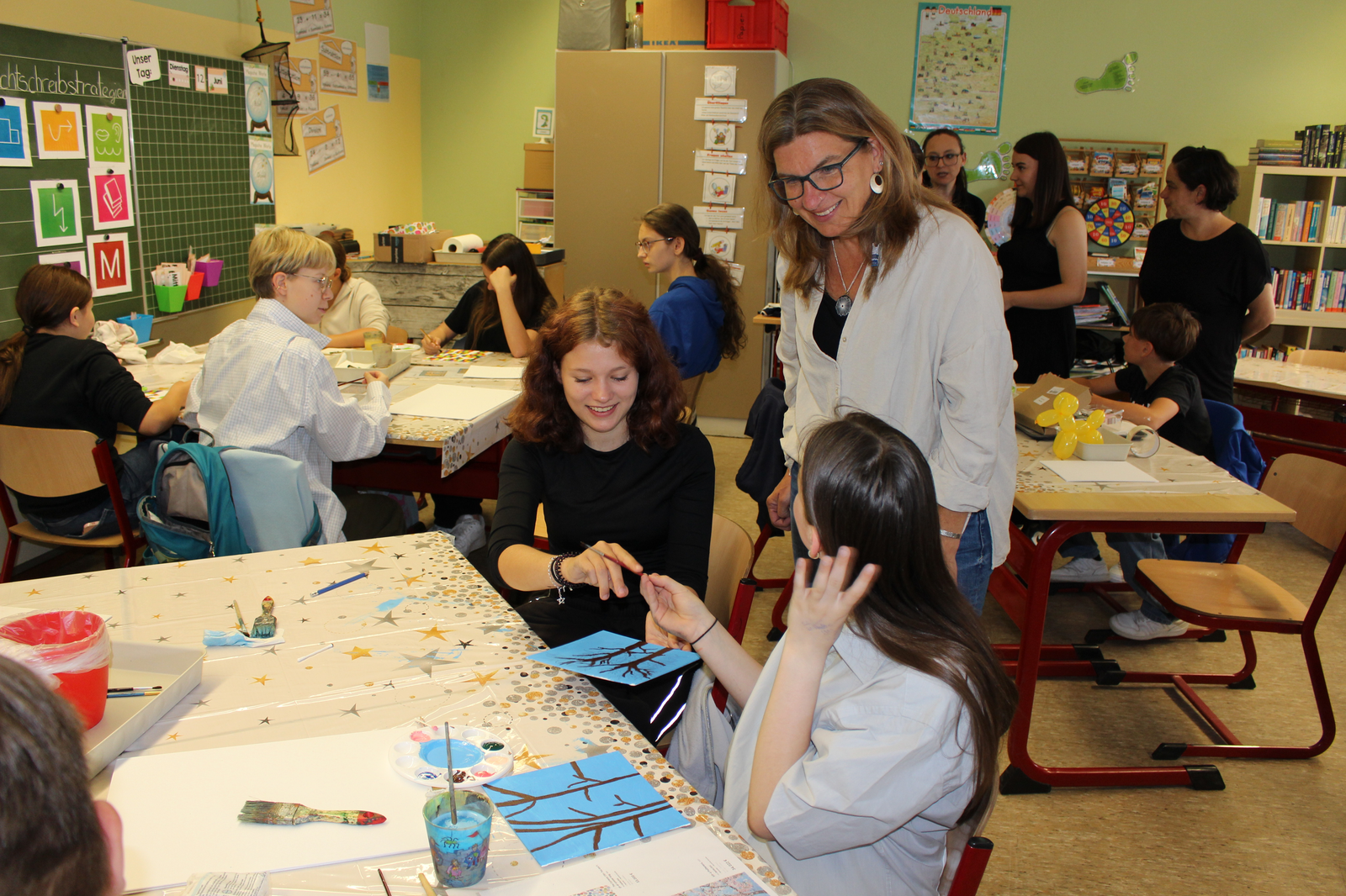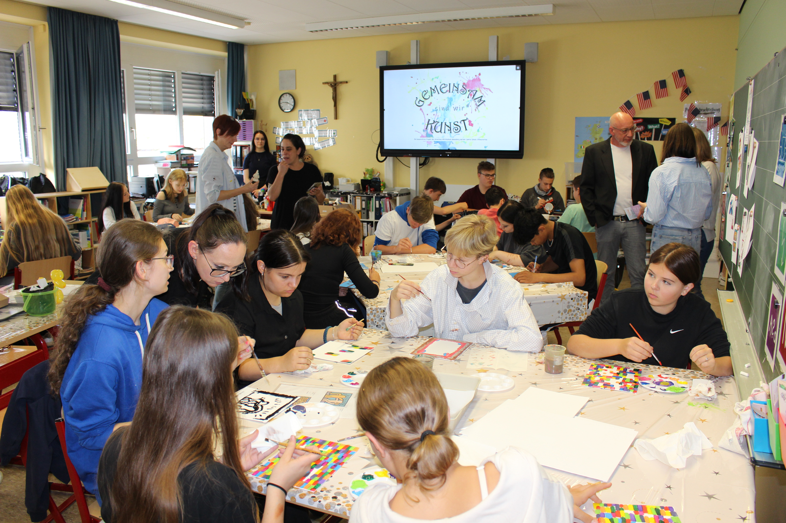 Unter dem Motto „Gemeinsam sind wir Kunst“ waren Schülerinnen und Schüler der Cabrinischule Offenstetten am Mittwoch (12. Januar 2024) zu Gast in der Aventinus Mittelschule Abensberg, um mit der Klasse 7c kreativ zu arbeiten. Die entstandenen Kunstwerke werden beim Schulfest der Mittelschule am Samstag, 13. Juli, ausgestellt und versteigert. Der Erlös geht an ein Kinderhilfsprojekt – „Das macht die Kinder besonders stolz“, sagen Bettina Sußebach, Lehrerin der Ganztagsklasse, und ihre Kollegin Eva Bürger. Frau Bürger ist Lehrerin der Berufsschulstufe an der Cabrinischule. Die Lehrerinnen kennen sich von Berufsschulmessen und so stand der gemeinsamen Aktion nichts im Wege.