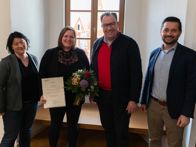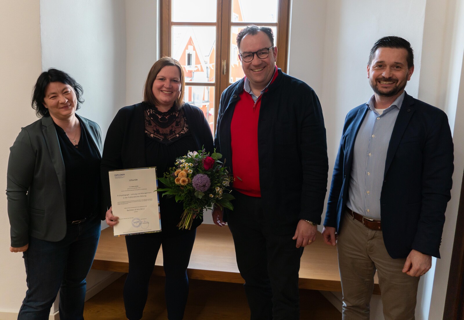 Frau Winkler war von September 2011 bis September 2022 als Erzieherin und stellv. Leiterin im Kindergarten Lummerland tätig. Zum 01. Oktober 2022 hat sie die Leitung des Kindergartens übernommen. Die Stadt Abensberg freut sich über die Weiterqualifizierung von Frau Winkler und 1. Bürgermeister Dr. Bernhard Resch, Hauptamtsleiter Andreas Müller sowie Personalratsvorsitzende Melanie Schlauderer gratulierten hierzu herzlich.