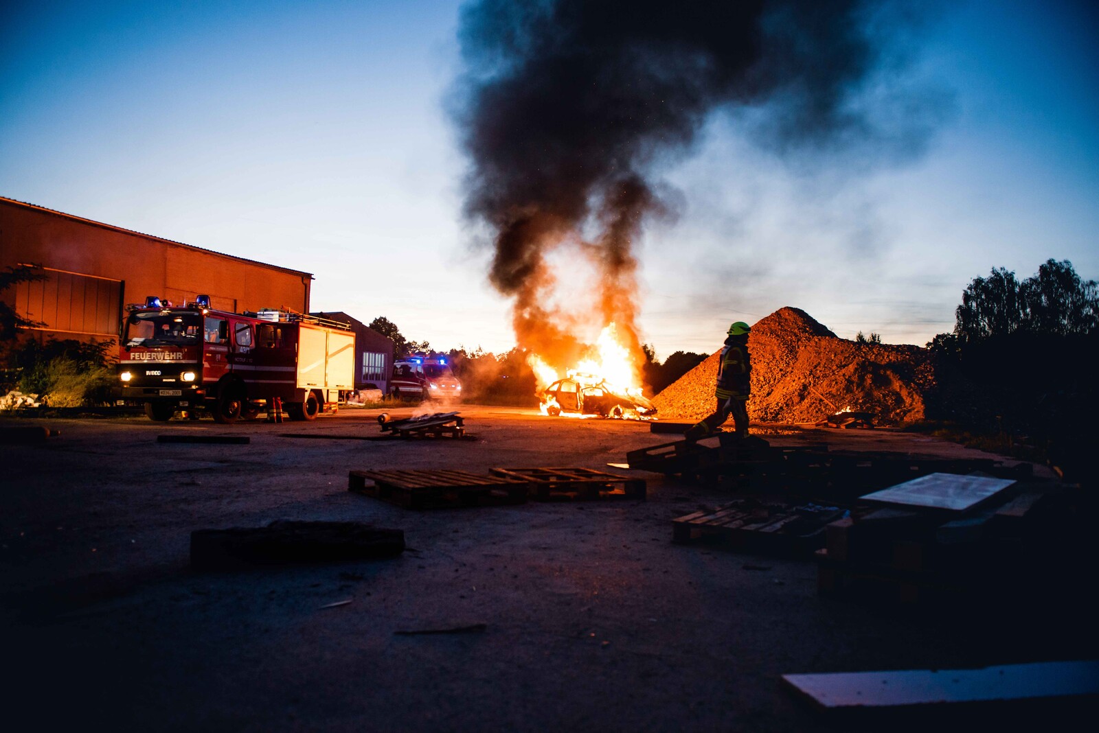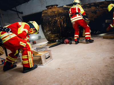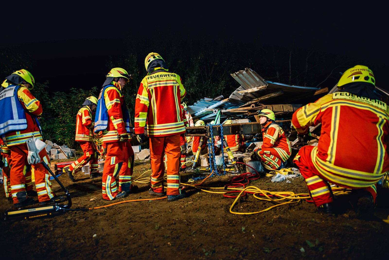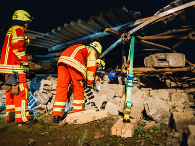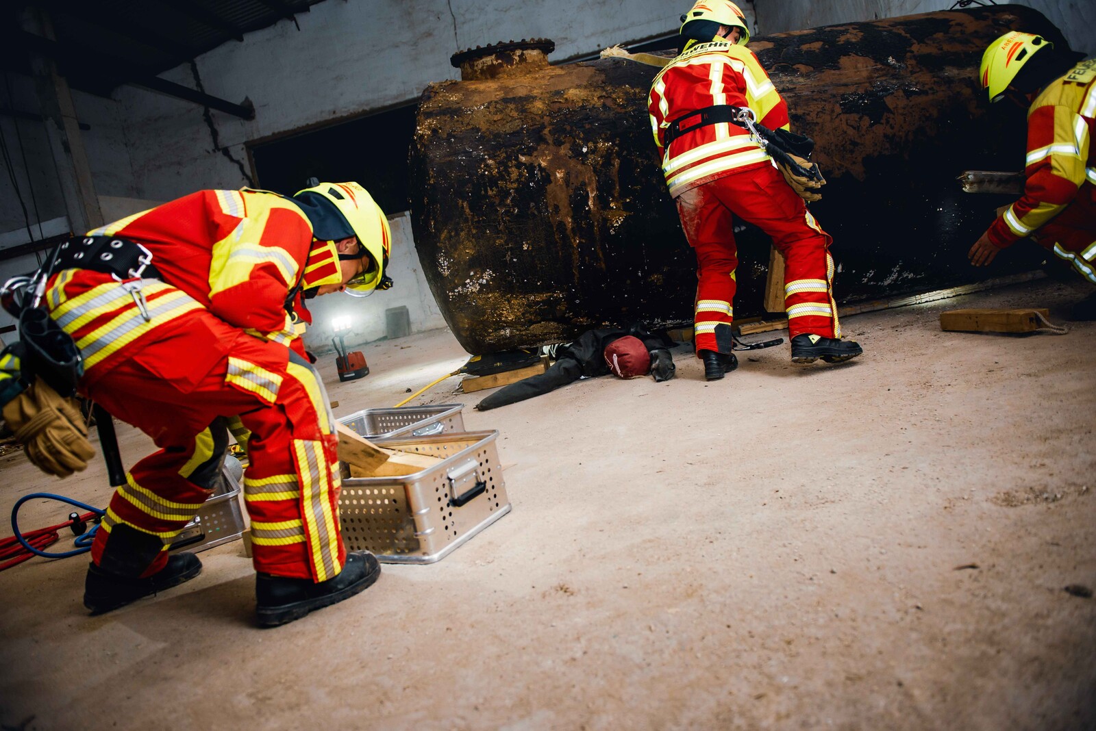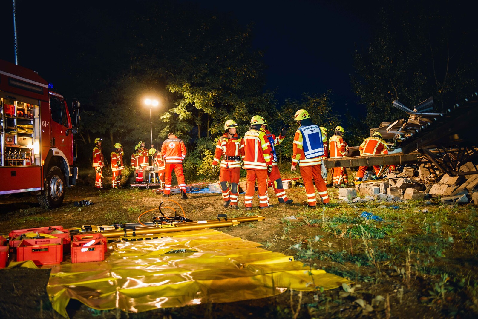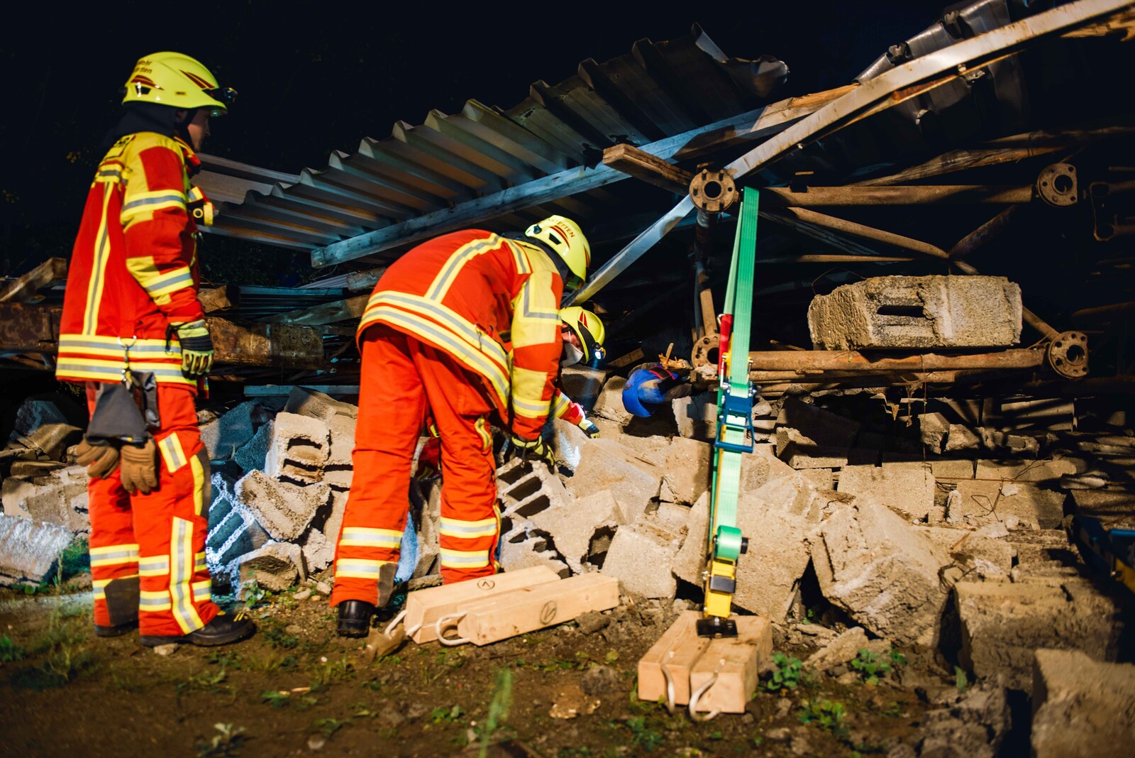 Die Szenerie: Bei Abrissarbeiten ist es zu einer Gasexplosion gekommen, bei der ein Gebäude komplett eingestürzt ist und mehrere Arbeiter unter Trümmern begraben hat. Durch das Herumfliegen teils brennender Teile wurden unter anderem Paletten sowie ein geparkter PKW entzündet. Ein in der Halle beschäftigter Arbeiter wurde durch einen umgestürzten Tank schwer eingeklemmt. Die auftretende Druckwelle hat zwei Arbeiter, die an einem Silo eine Funkantenne zurückbauen wollten, erfasst und einen der beiden durch die geöffnete Dachhaut in den Dachstuhl einstürzen lassen. Auf der Flucht aus dem Gefahrenbereich ist eine weitere Person in einen Schacht gefallen und blieb dort verletzt liegen.