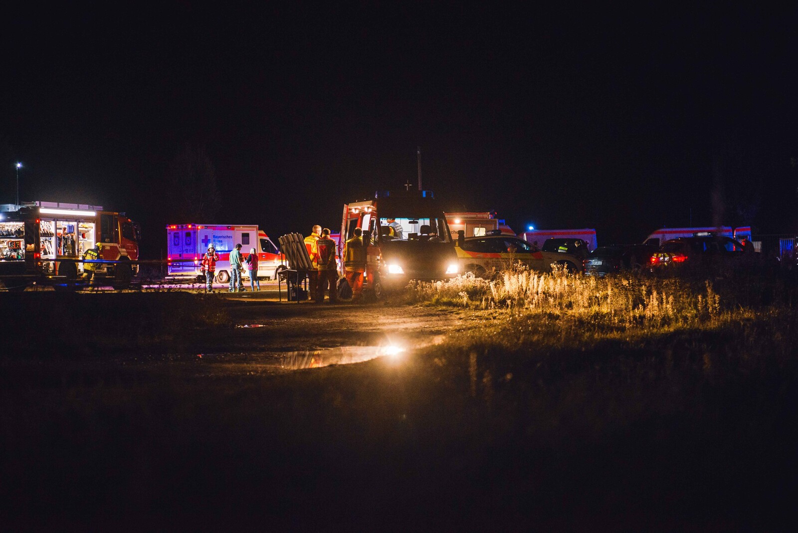 Das Schadensgebiet wurde von der Einsatzleitung in Abschnitte aufgeteilt und die Aufgaben wurden dann von den jeweiligen Einheiten abgearbeitet. Der Bereitstellungsraum für alle Einsatzfahrzeuge war zunächst im Kreuzungsbereich Staatsstraße/Buchenrieder-Gelände. Das hat sicherlich bei einigen Verkehrsteilnehmern zu einer kurzzeitigen Irritation geführt, konnte aber nicht verhindert werden, um die Rettungskräfte in der Folge zielgenau einsetzen zu können. Bei dieser anspruchsvollen Großübung mit einer hohen Zahl an Verletzten, bei der sowohl die Brandbekämpfung als auch die technische Hilfeleistung gleichzeitig im Vordergrund stehen sollten, wurde die, über die Organisationen greifende Hilfeleistung geprobt. Bei der Abschlussbesprechung betonte eine Helferin: „Für mich ist das schon ein herausragendes Bild, wenn sich Helfer von DLRG, BRK und Feuerwehr gleichzeitig um einen Verletzten kümmern und diesen gemeinsam versorgen.“