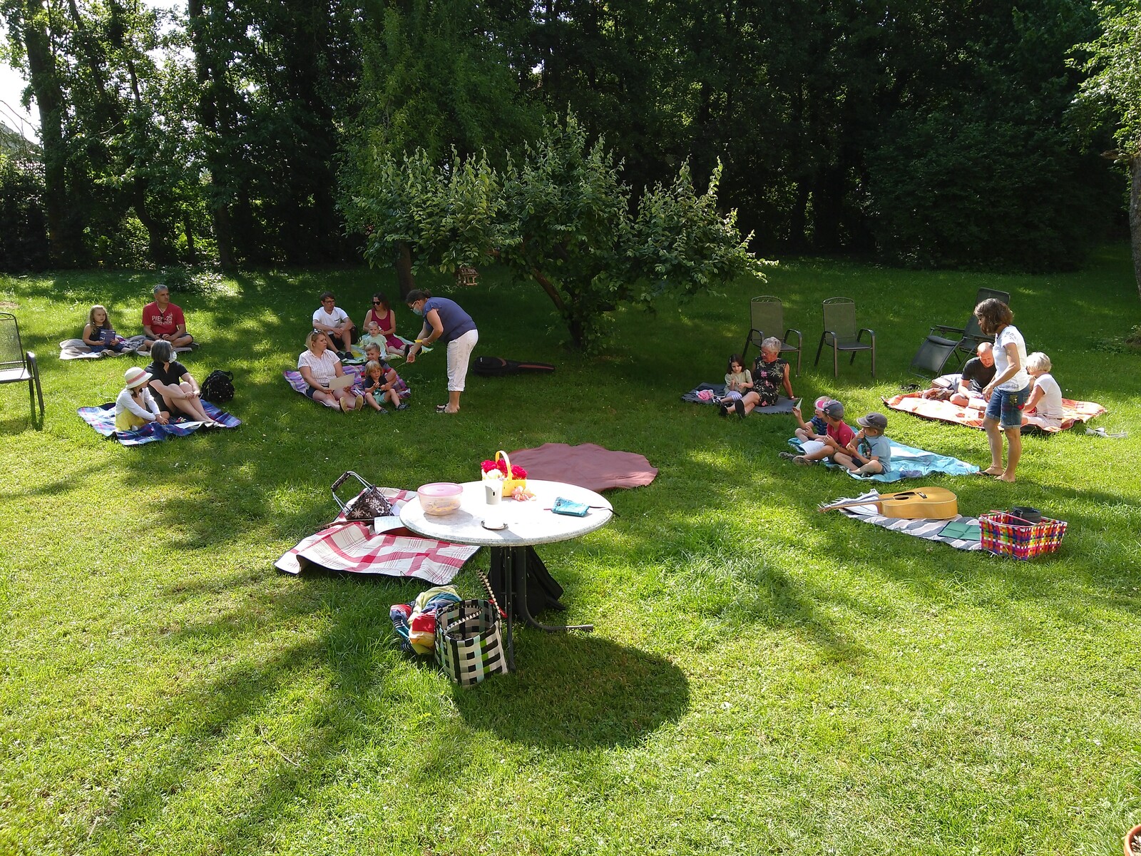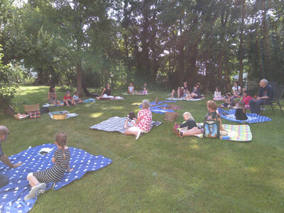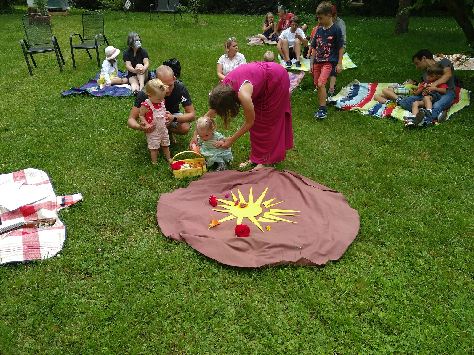 Sie berichtet weiter: "Ja, normal war in letzter Zeit nix - und so fiel auch die Kinderkirche eine ganze Zeitlang aus. Im Juni dann trauten wir uns einen Versuch zu starten: Kinderkirche im Garten des Pfarrhauses. Unter dem Motto "Gottes Liebe ist wie die Sonne" ließen wir uns bei tatsächlich herrlichem Sonnenschein auf mitgebrachten Picknickdecken im Pfarrgarten nieder. Wie hörten eine schöne Geschichte und verglichen die Sonne mit unserem lieben Gott, der auch immer für uns da ist - selbst an trüben Tagen."