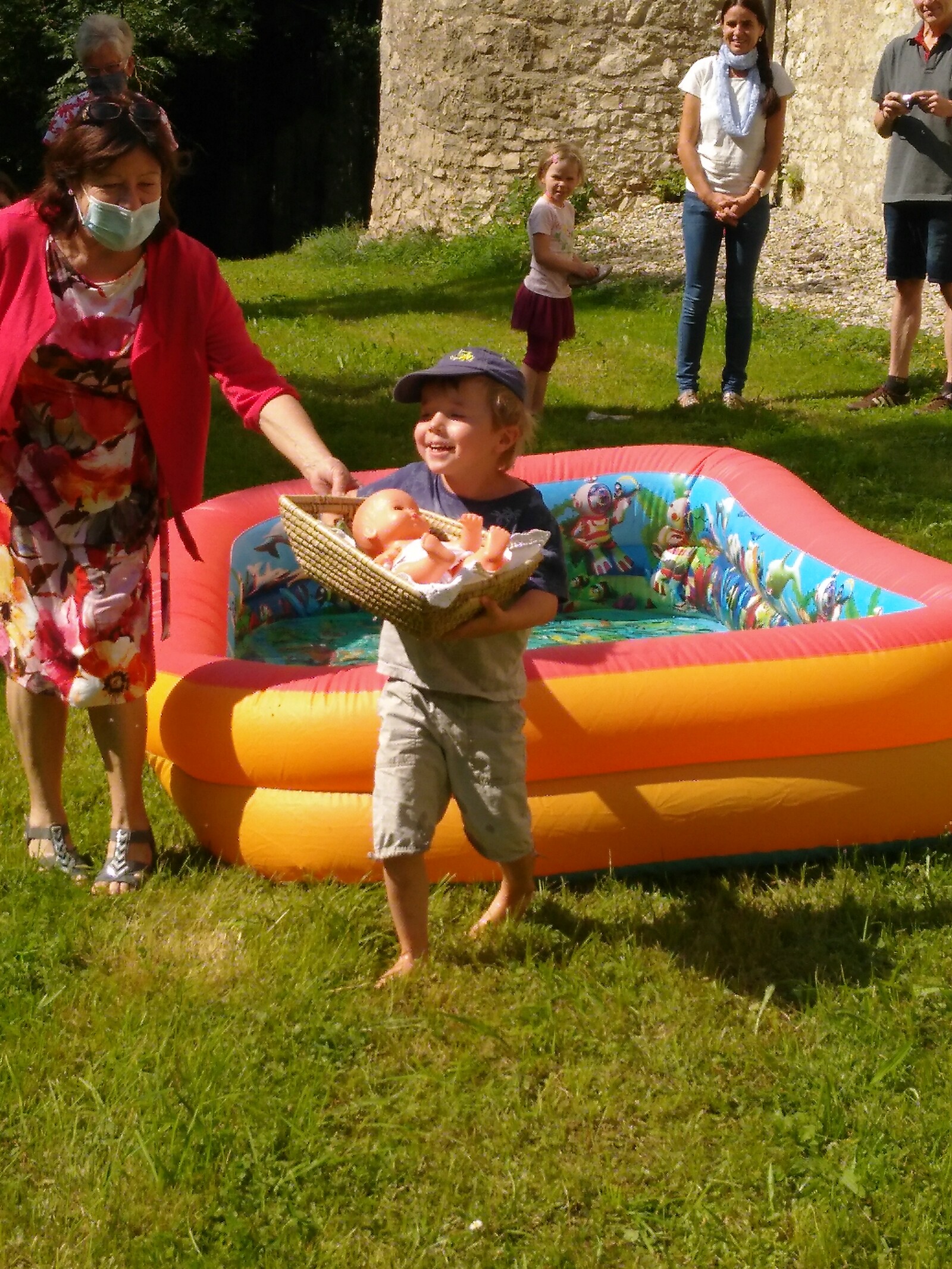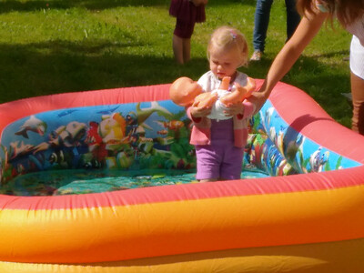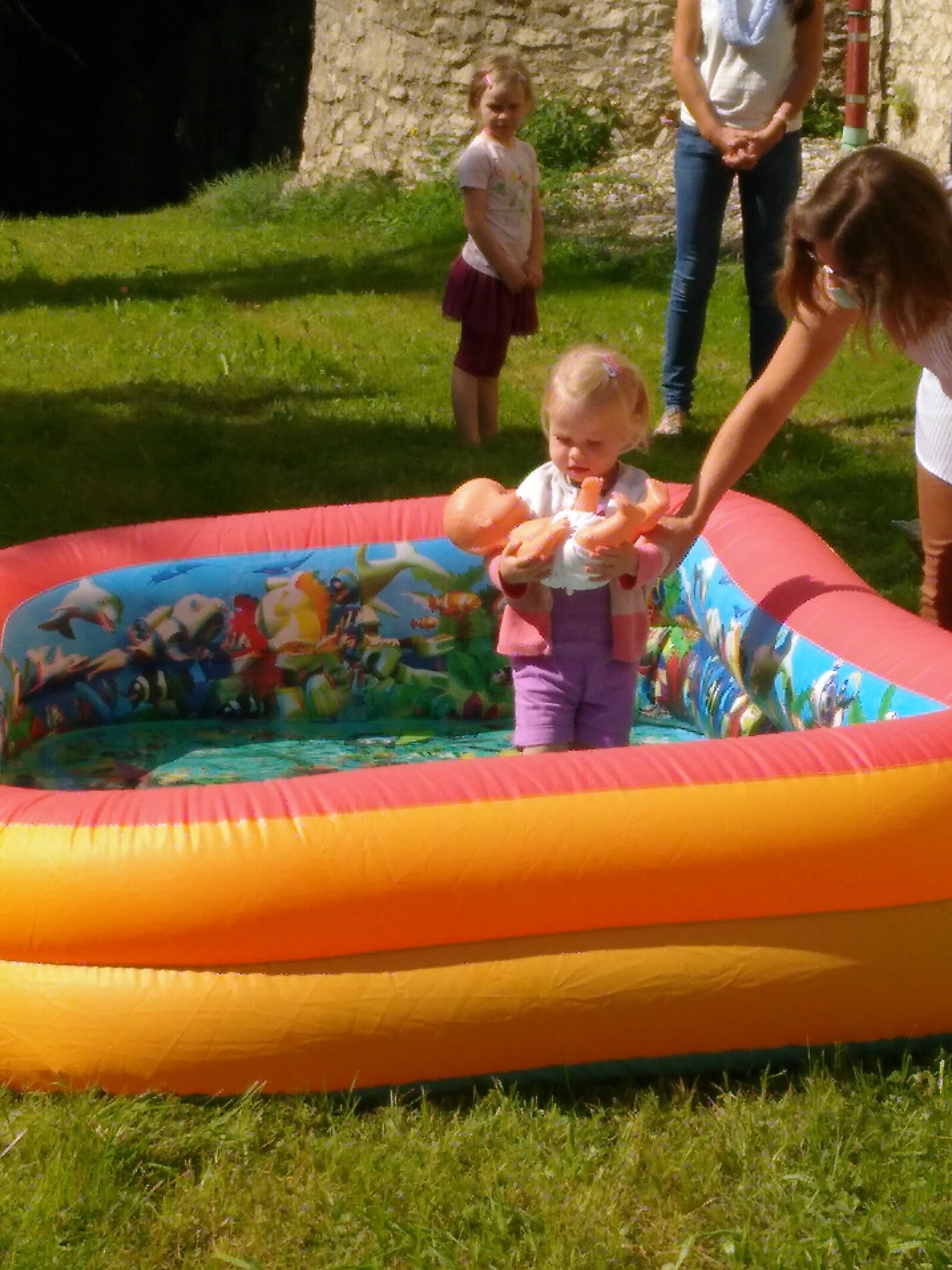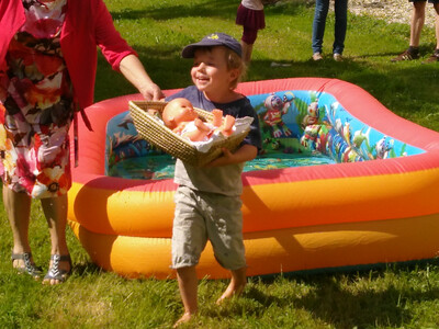 Im Juli hatten sie wieder Glück mit dem Wetter und trafen sich zur Kinderkirche, "um uns die Geschichte vom Hl. Christophorus genauer anzuschauen. Nach der Geschichte durfte sich dann jedes Kind auch als Christusträger (Übersetzung des Namens des Heiligen) versuchen. Einmal das Jesuskind durch die Fluten des Wasserbeckens zu tragen! Selbst die Kleinsten waren mutig genug und brachten das Jesuskind heil ans andere Ufer", so Frau Habel.