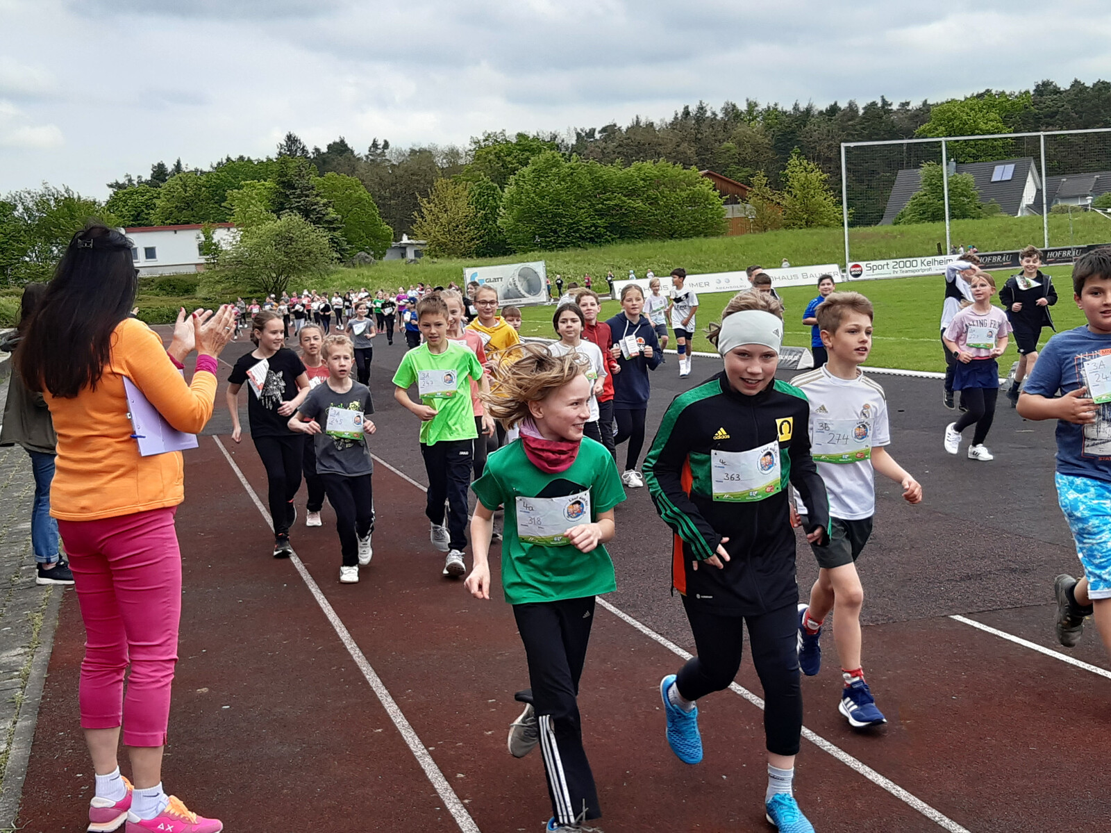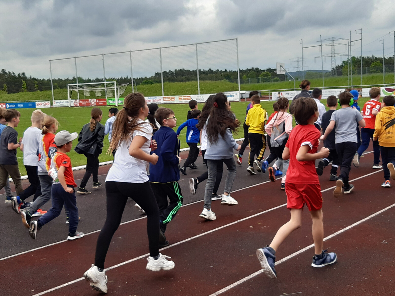 Im neuen Stadion gingen die rund 400 Erst- bis Viertklässler am vergangenen Freitag (19. Mai 2023) an den Start. Dort drehten sie Runde um Runde, bis nach 15 Minuten die vorauslaufenden Lehrerinnen zunächst das grüne Tuch in die Luft hoben. Das erste Teilziel war erreicht. Mit diesem Erfolg in der Tasche hörten die ersten Kinder zufrieden auf. Viele aber liefen weiter, obgleich die Lehrerinnen vom Rand riefen: „15 Minuten habt ihr geschafft! Ihr könntet auch aufhören!“ Doch da blitzte es in so manchem Kinderauge. Der Ehrgeiz hatte viele Jungen und Mädchen gepackt, jetzt auch 30 Minuten durchzuhalten. Und tatsächlich liefen viele bis zum Schluss!