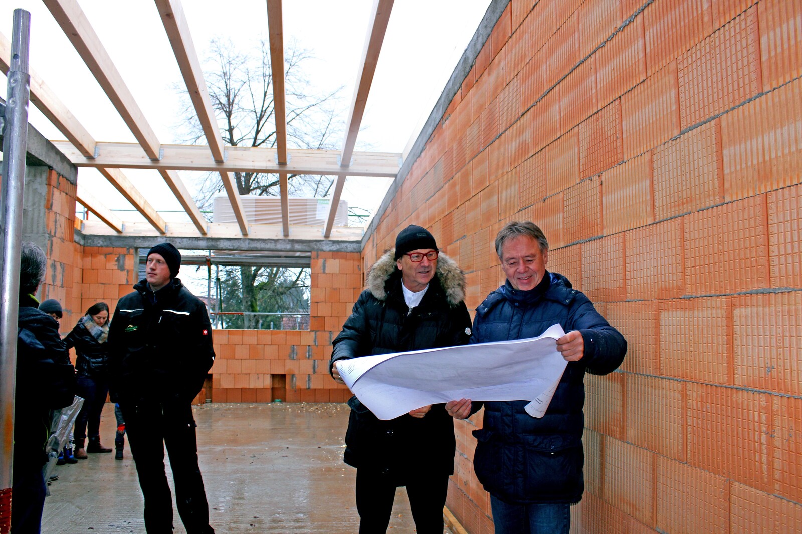 Der Hauptraum der Mensa ist für jeweils 30 kleine Leute konzipiert. Da der Kindergarten dreigruppig ist, erfolgt die Benutzung schichtweise. Ein Bio-Caterer sorgt für das leibliche Wohl der Kinder; die Küche muss in erster Linie also als Aufwärmküche funktionieren, ist aber voll ausgestattet. Neben Küche und Aufenthaltsraum/ Esszimmer wird eine so genannte Schmutzschleuse eingerichtet mit Spinden und Kleidungsunterbringung. Von dort aus geht es in die Außenanlagen und den dortigen Spielbereich. Hans Schmid, stellvertretender Leiter der Stadtwerke und derzeit im Bauamt für mehrere Projekte verantwortlich, ist zuversichtlich: „Trotz einiger Materialengpässe liegen wir im Zeitplan“. Die Fertigstellung wird im März 2022 erfolgen. Zeitlich eine Punktlandung. Auch finanziell hat er mit den beteiligten Firmen alles getan, damit die Kostenschätzung nicht zur Makulatur wird. Und das, obwohl die ursprüngliche Planung keine Be- und Entlüftungsanlage vorgesehen hatte – die aber angesichts der Corona-Pandemie nötig wurde. Schmid: „Bei einer solchen Anlage findet ein echter Luftaustausch statt.“ Das sei weitaus besser als Luftfilteranlagen.