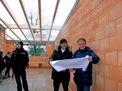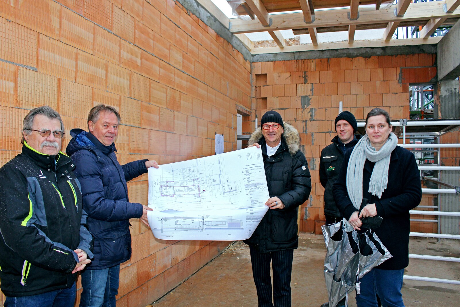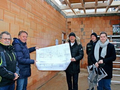 Der Rohbau steht, jetzt fehlt noch das Dach – dann kann über den Winter der Innenausbau erfolgen und ab März 2022 bietet der Kindergarten St. Vitus der Katholischen Jugendfürsorge in Offenstetten eine Mensa für seine kleine Kundschaft an. Bauherr ist die Stadt Abensberg; die Kosten werden bei rund 550.000 Euro liegen. 1. Bürgermeister Dr. Uwe Brandl hat sich im September bei einem Termin mit allen Beteiligten vom Baufortschritt überzeugt.