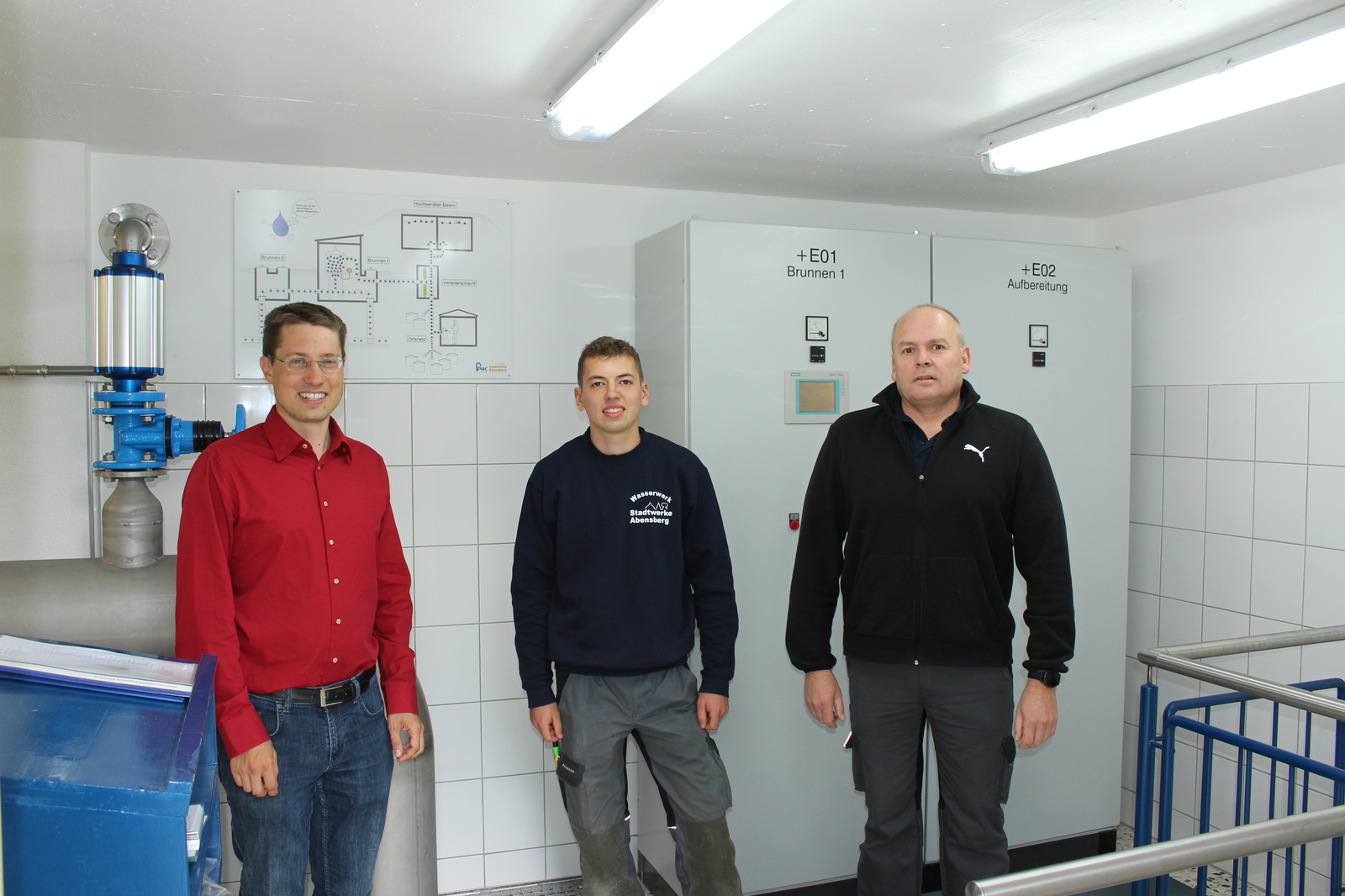 Im Foto oben von links Stadtwerkeleiter Dr. Rainer Reschmeier, Jakob Stocker und Wassermeister Wolfgang Ferg. In der Galerie ein Einzelfoto und nochmals das Hauptbild.
