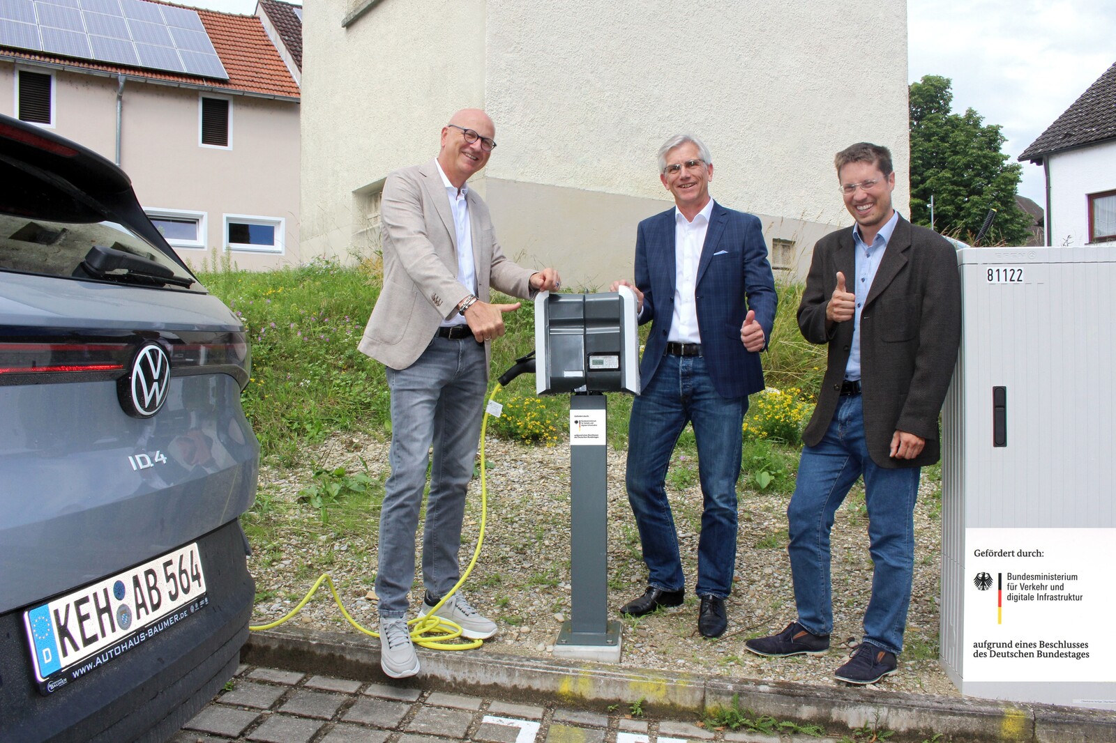 Im Hauptmotiv oben von links Abensbergs 1. Bürgermeister Dr. Uwe Brandl, Dr. Frank-Holger Dietzel und Dr. Rainer Reschmeier an den neuen E-Ladesäulen in der Aunkofener Straße auf Höhe der Hausnummer 15. Nochmals in der Galerie.