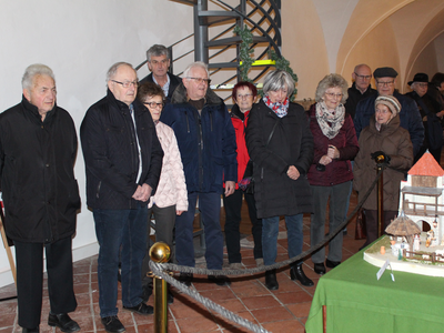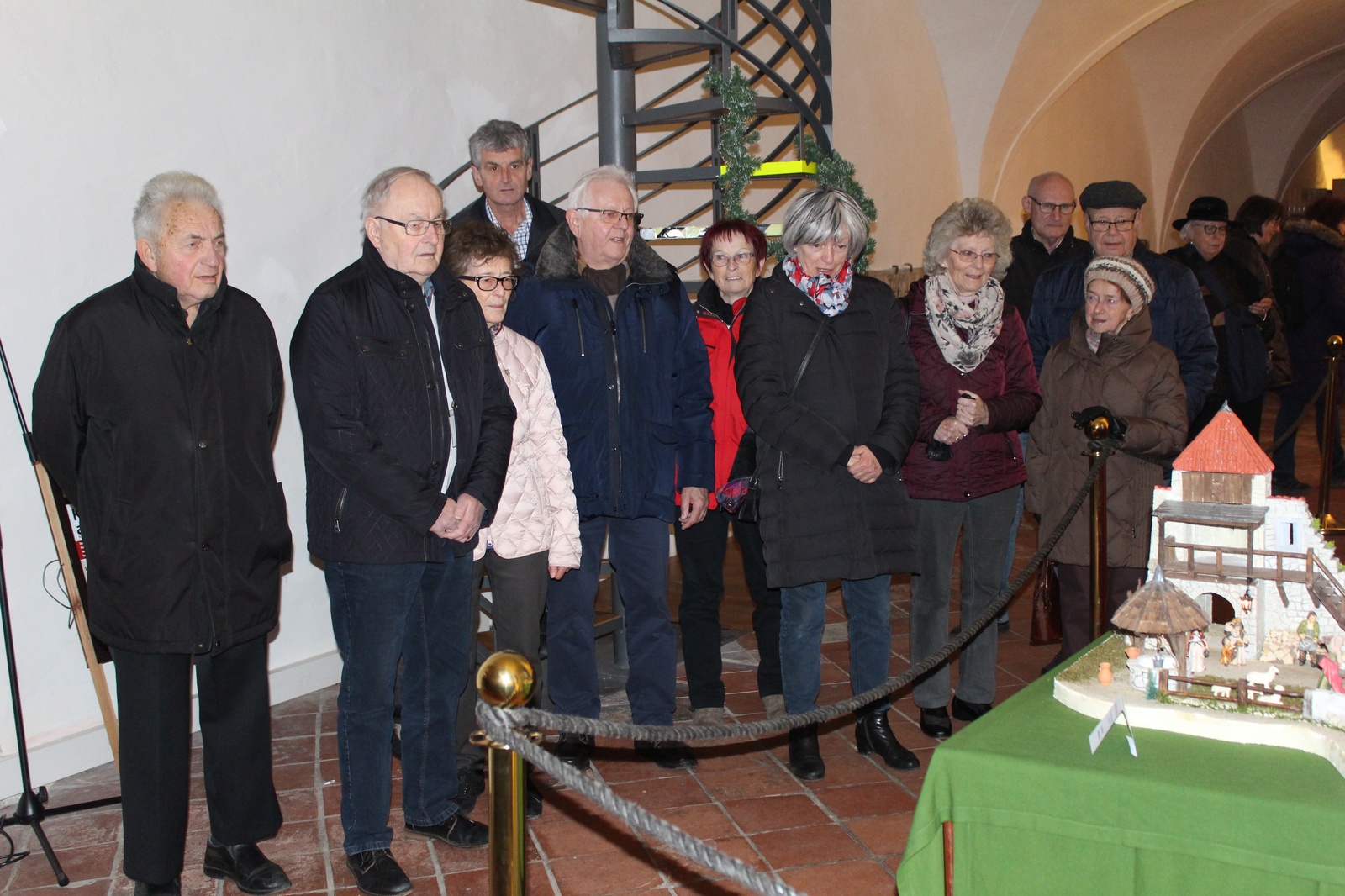 Dann ging es, mit einem Abstecher zur Schiefen Krippe im Schlossgraben, in den Kreuzgang, der schon von zahlreichen Besuchern gefüllt war. Gertraud Schretzlmeier, 2. Vorsitzende des Krippenvereins, freute sich, dass sich zur Eröffnung der Ausstellung so viele Mitglieder und Freunde des Krippenvereins eingefunden hatten. Schretzlmeier bedankte sich vor allem bei Krippenbaumeister Hans Spitzer und seinen Krippenbauern Albert Ferch, Richard Hummel und Erwin Meiler, die wieder viele Stunden in den Aufbau der Ausstellung investiert hätten. Gertraud Schretzlmeier dankte in diesem Zusammengang auch Georg Ipfelkofer und seinen Mitarbeitern vom Bauhof, die stets hilfreich zur Seite stehen, wie auch bei der Schiefen Krippe im Schlossgraben und der Schwimmenden Krippe auf der Abens.