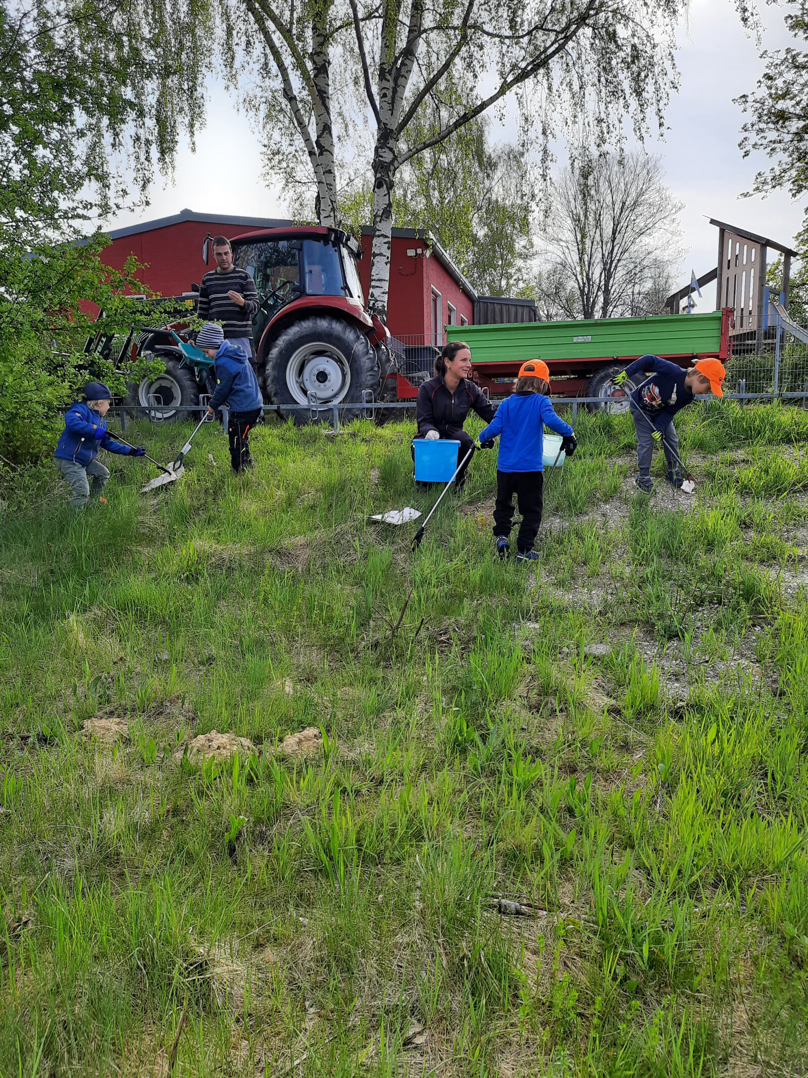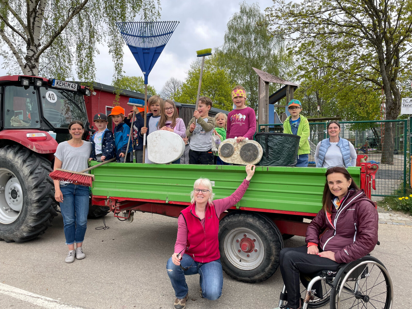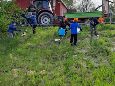 Allerlei kuriose Gegenstände sammelten die Kinder, ihre Eltern und das Team des Kinderhauses am Freibadberg rund um die Parkplätze und den Eingang des Kindergartens auf: Eine Herdplatte, einen Monitor, Schlittschuhe und sogar eine Klobrille befanden sich unter den gefundenen Gegenständen. Glücklicherweise stellten die Eltern eines der Kinderhaus-Kinder ihren Traktor samt Anhänger bereit, um den Müll zum Wertstoffhof zu bringen und dort fachgerecht zu entsorgen.