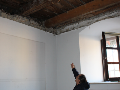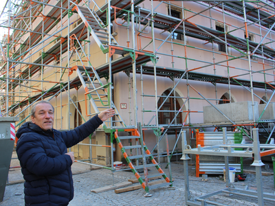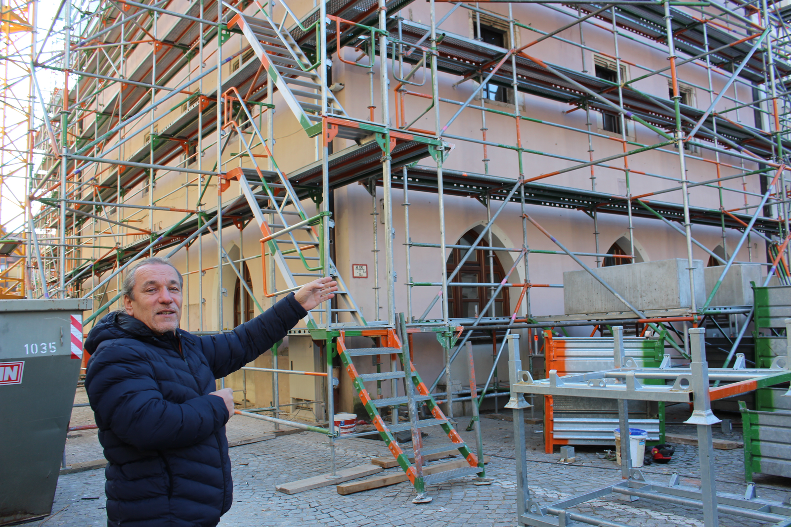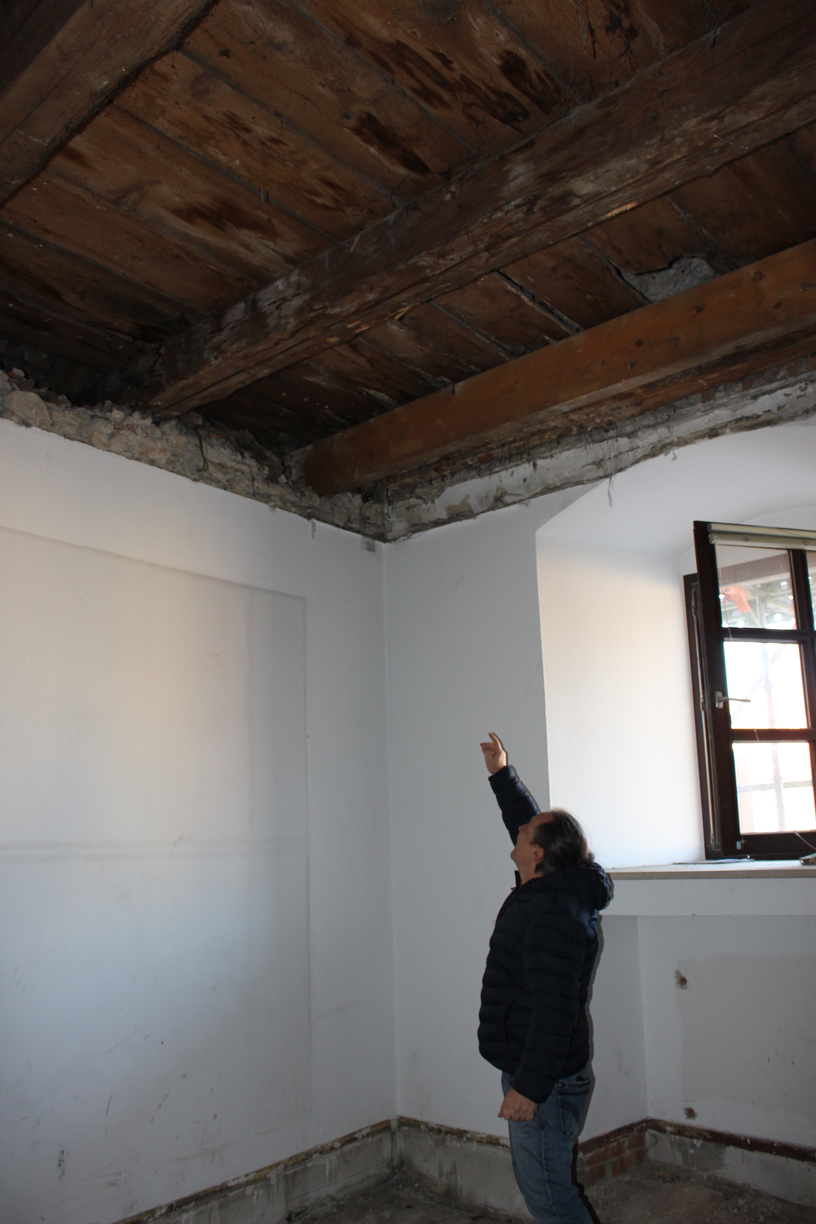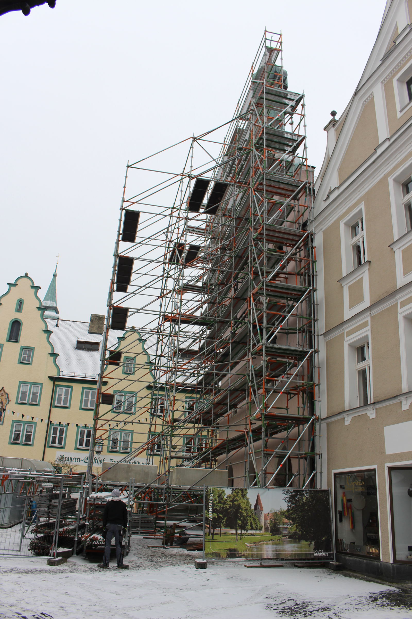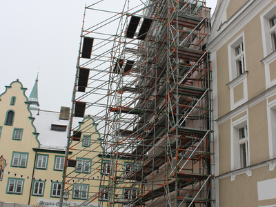 Rölz: „Die Zerrbalken unterhalb des Dachgeschoßes sind umfangreich zerstört.“ Diese halten - vereinfacht gesagt - die Wände des alten Rathauses zusammen. Das heißt: „Sobald wir mit dem Abbau des Dachstuhls beginnen, wird der Nordgiebel instabil.“ Um das zu vermeiden, werden Gerüst-Türme errichtet, die den Nordgiebel sichern. Dann kann mit dem Abbau des Dachstuhls begonnen werden; darauf folgt ein Ersatzdach, das über der gesamten zukünftige Dachfläche errichtet wird. Darunter entsteht der neue Dachstuhl. Wenn der komplett ist, wird das Ersatzdach abgebaut – und dann können auch die vier Gerüst-Türme vom Stadtplatz verschwinden, die zur Absicherung des Giebels nötig sind. Dies wird nach Schätzung von Rölz bis in den Frühling andauern.