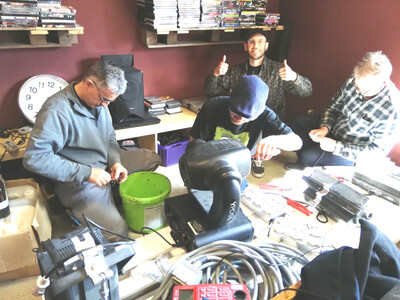 Im Bild (von Evi Bartos) die ehrenamtlichen Prüfer des Reparatur-Cafés im Einstaz im Jugendzentrum. Daumen hoch für diese Aktion, findet sicher nicht nur Daniel Hörber, 2. Vorstand im Gleis 1. (Foto: Evi Bartos)