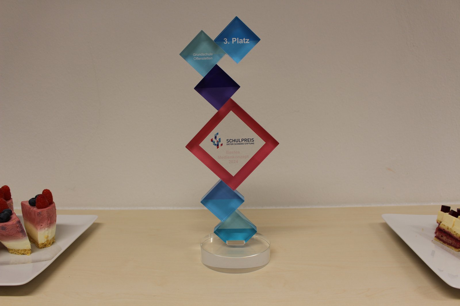 Vor Ort war es dann „sehr spannend“, so Frau Köppl. Eine Schule nach der anderen wurde auf die Bühne gerufen, die Offenstetten-Gruppe wollte schon gar nicht mehr an einen Sieg glauben – bis verkündet wurde, dass zwei dritte Preise vergeben werden: an die Grundschule Köppern nach Friedrichsdorf und eben an die Grundschule Offenstetten. „Das Medienkonzept der Grundschule Offenstetten aus Bayern zeigt eindrucksvoll, wie digitale Zukunftskompetenzen in das Schulcurriculum integriert und im Alltag lebendig werden können“, heißt es dazu in der Presseinformation der Stiftung. Rektorin Köppl hat der Preis noch etwas gezeigt – ein gutes Team: „Ich danke allen Kolleginnen und Kollegen herzlich. Dass wir das so ermöglicht haben, ist nicht selbstverständlich.“ Mit selbstgebackenen Törtchen lud Frau Köppl – die am selben Tag Geburtstag hatte - alle zur gemütlichen Feier ins Lehrerzimmer.